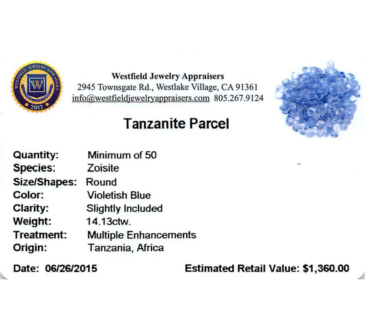 Over 200 round mixed cut natural tanzanites, measuring 2.00 - 2.00 x 1.30 mm, exact total weight 14.13ct., clarity is slightly included, type I, medium, very slightly grayish, violetish blue color, (GIA vB 5/3), cut is good. Measurements & the color grade are an average for the group, Color grade is an average for the group, Transmitting light with no distortion, transparent, Naturally occurring internal & external characteristics are present, Indications of multiple laboratory enhancements, including high temperature heat treatment. Westfield Appraised at $1,360.00.