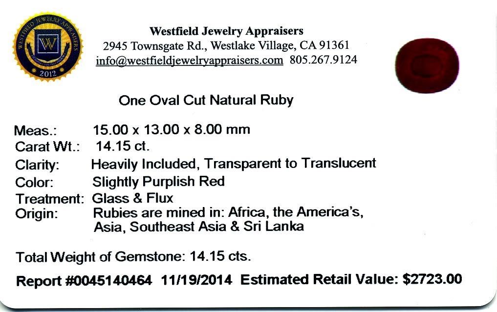 14.15ct. One Oval Cut Natural Ruby Westfield Appraised at $2,723.00.
