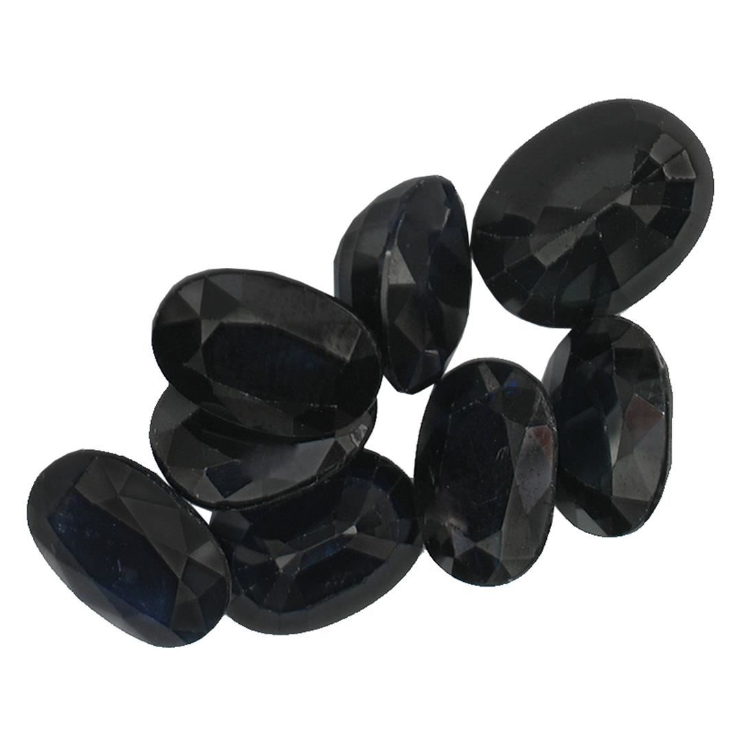 Eight oval mixed cut natural blue sapphires, measuring 8.00 x 6.00 x 4.00mm, exact total weight 14.15ct., clarity is heavily included, type II, very dark, very slightly grayish, blue color, (GIA B 8/3), cut is good. Measurements are an average for the group. Transmitting light diffusely, opaque. Naturally occurring internal & external characteristics are present. Indications of multiple laboratory enhancements. Westfield Appraised at $1,620.00.