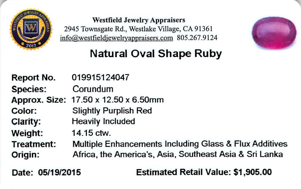 One oval mixed cut natural ruby, measuring 17.50 x 12.50 x 6.50mm, exact weight 14.15ct., clarity is heavily included, type II, medium dark, very slightly brownish, slightly purplish red color, (GIA slpR 6/3), cut is good. Transmitting light somewhat diffusely, transparent to translucent. Naturally occurring internal & external characteristics are present. Indications of laboratory high temperature heat treatment, with glass & flux additives. Ruby has a low tolerance to rhodium plating, repolishing the surface, & ultrasonic cleaning. Westfield Appraised at $1,905.00.