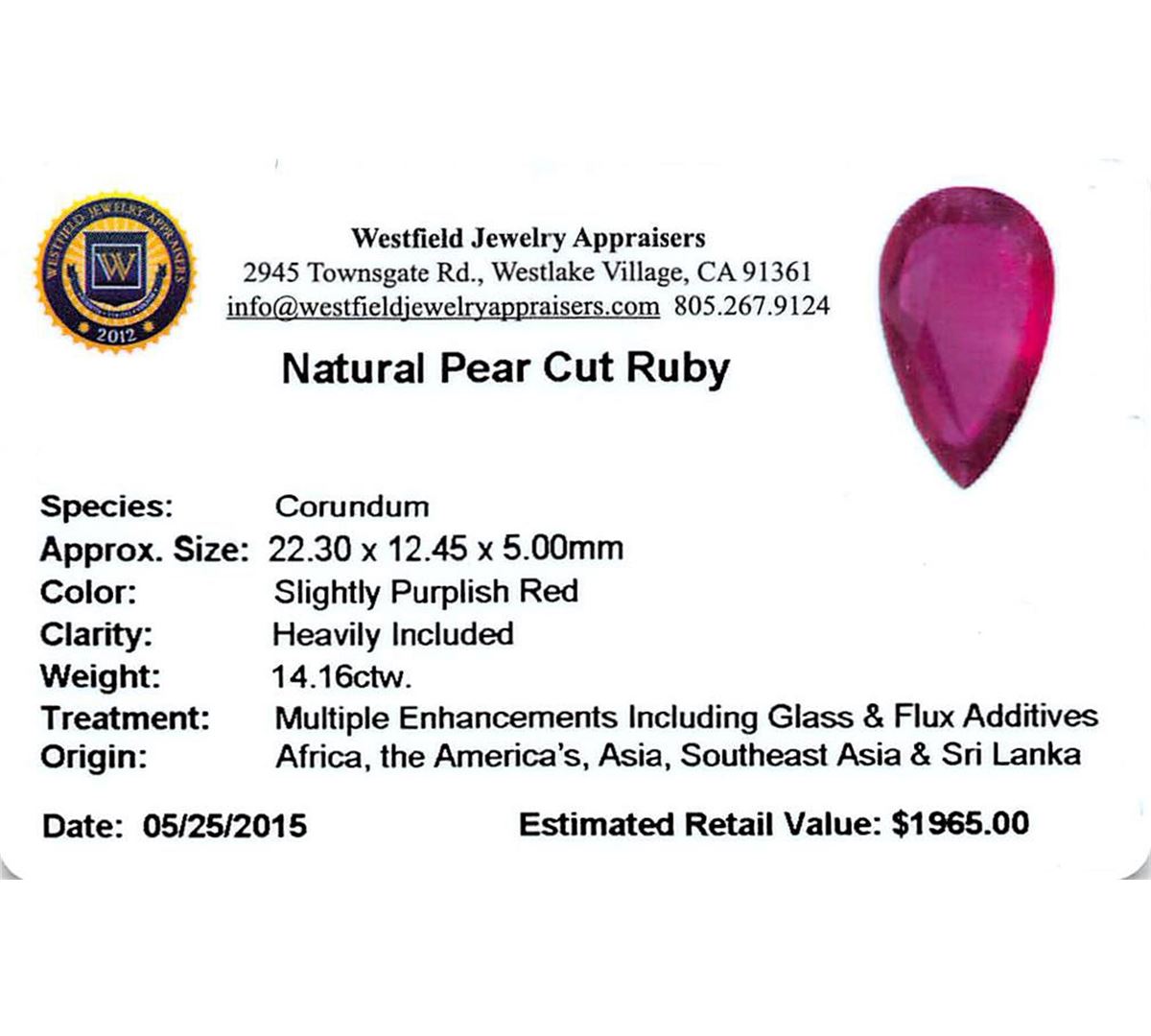 One pear mixed cut natural ruby, measuring 22.00 x 13.00 x 5.60mm, exact weight 14.16ct., clarity is heavily included, type II, medium dark, moderately strong, slightly purplish red color, (GIA slpR 6/4), cut is good. Transmitting light somewhat diffusely, transparent to translucent, Indications of laboratory high temperature heat treatment, with glass & flux additives. Low tolerance to rhodium plating, repolishing the surface & ultrasonic cleaning. Westfield Appraised at $1,965.00.