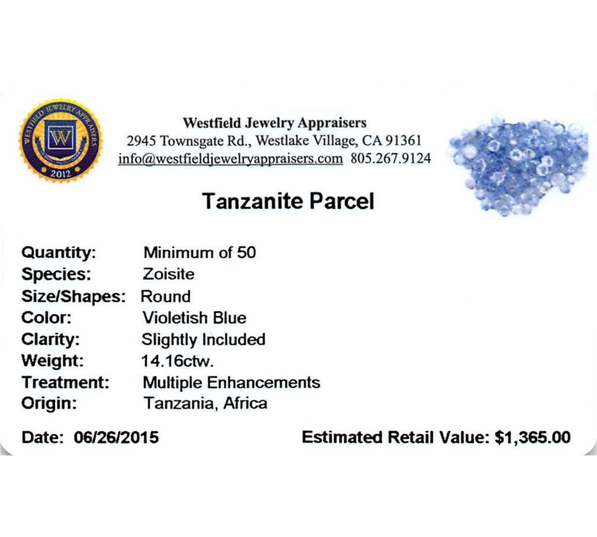 Fifty round mixed cut natural tanzanites, measuring 2.00 - 2.00 x 1.30 mm, exact total weight 14.16ct., clarity is slightly included, type I, medium light, very slightly grayish, violetish blue color, (GIA vB 4/3), cut is good. Measurements & the color grade are an average for the group, Color grade is an average for the group, Transmitting light with no distortion, transparent, Naturally occurring internal & external characteristics are present, Indications of multiple laboratory enhancements, including high temperature heat treatment. Westfield Appraised at $1,365.00.