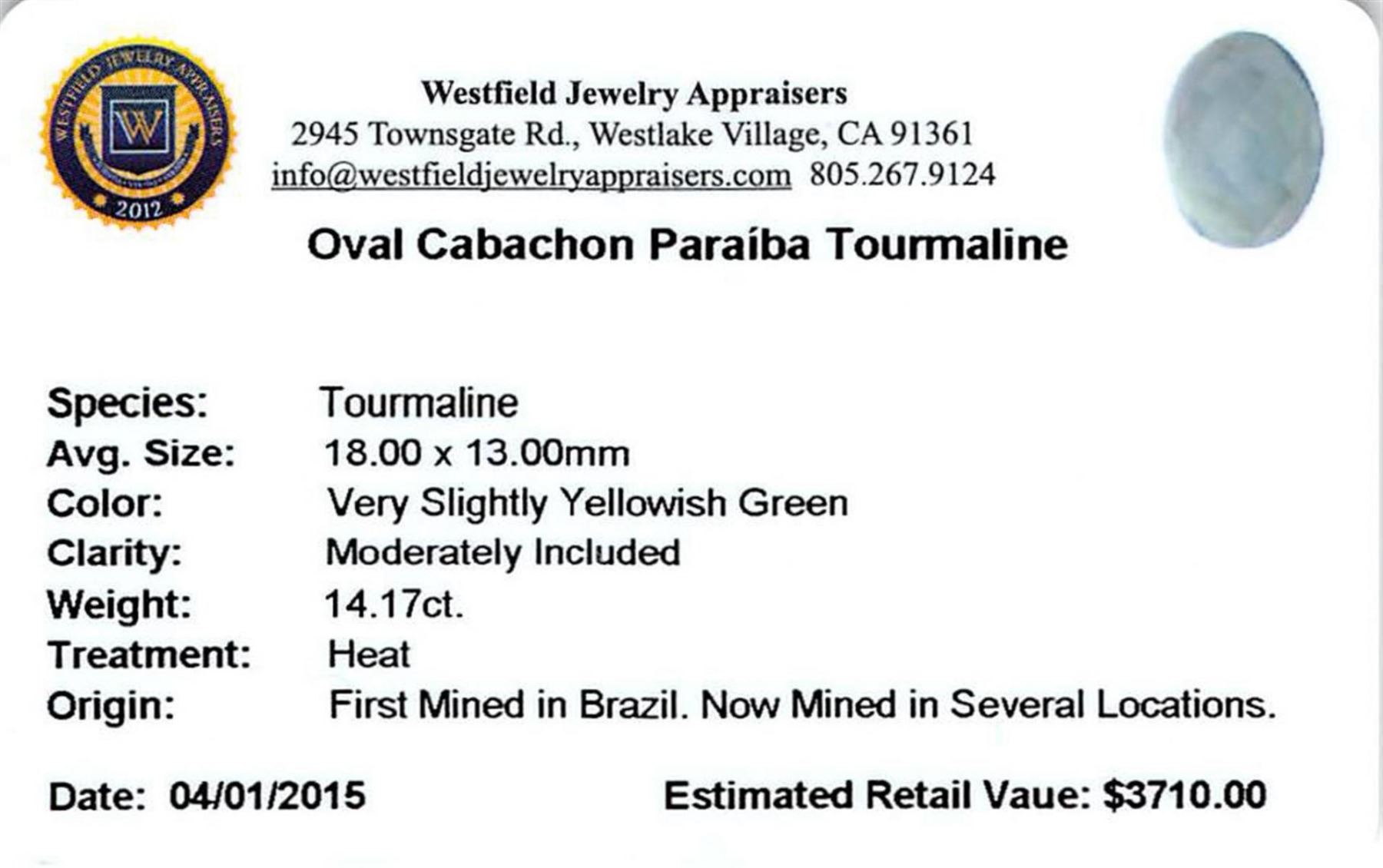 One oval cabochon cut natural Paraiba tourmaline exact weight 14.17ct., clarity is moderately included, cut is good. Westfield Appraised.
