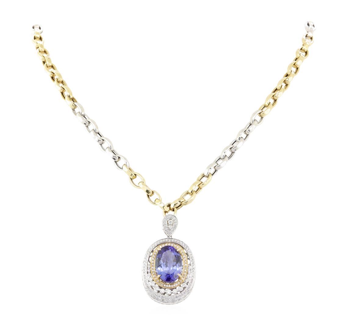 One electronically tested 14KT white gold ladies tanzanite and diamond pendant/enhancer with chain. The pendant/enhancer features a tanzanite set within a two tiered diamond lattice gallery, completed by a diamond set hinged snap locking bail with safety. The pendant/enhancer is supported by an eighteen inch length 14KT white and yellow gold designer style link chain terminating in a lobster claw clasp. Bright polish finish, with yellow gold accents and milgrain detailing. Trademark is ORIANNE. Identified with markings of "14K". Condition is new, good workmanship. Containing: One prong set oval mixed cut natural tanzanite, measuring 17.40 x 12.30 x 8.90mm, 8% bulge factor, approximate weight of 14.17ct., clarity is eye clean, type I, medium, very slightly grayish, violetish blue color, (GIA vB 5/3), cut is good. Transmitting light with no distortion, transparent. Colored Stone Grading Report attached. Graded in the setting. Tanzanite is a very rare gemstone that is only found in the country of Tanzania. Originally discovered in 1967. Tiffany & Company, named the stone Tanzanite. It is found in the Usumburu Mountains that border the Umba Valley of northern Tanzania. Tanzanite occurs in gray, brown, violet, blue, reddish-purple, & green. The gem is interesting because of its exceptional pleochroism. Rotated in different directions a tanzanite will exhibit multiple changes of color. Tanzanite has a low tolerance to ultrasonic cleaning, and should not be cleaned using this method. One Hundred Seventy-Six prong & bead set round brilliant cut diamonds, measuring 2.40 - 1.10 x 1.05mm (depth est.) approximate total weight of 176 Stones = 1.48ct. Graded in the setting. Clarity I-1 to I-2 Color G - I Total Weight of Colored Stones 14.17 ct. Total Weight of Diamonds 1.48 ct. Estimated Retail Value $ 41,720.00 US