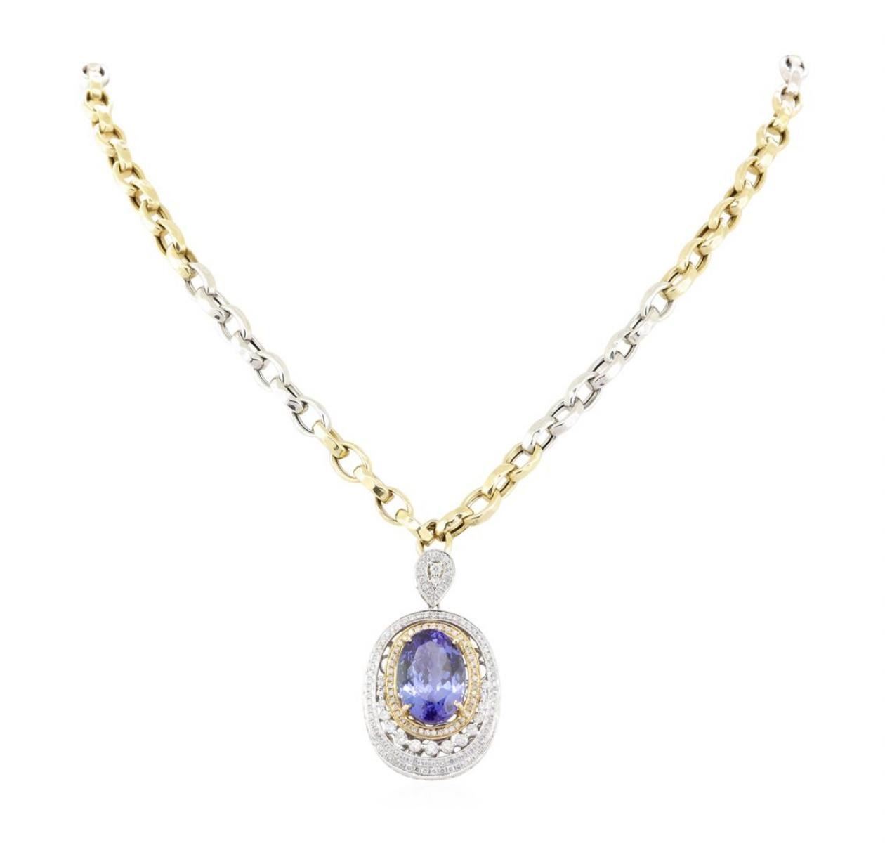 One electronically tested 14KT white gold ladies tanzanite and diamond pendant/enhancer with chain.  The pendant/enhancer features a tanzanite set within a two tiered diamond lattice gallery, completed by a diamond set hinged snap locking bail with safety. The pendant/enhancer is supported by an eighteen inch length 14KT white and yellow gold designer style link chain terminating in a lobster claw clasp. Bright polish finish, with yellow gold accents and milgrain detailing.  Trademark is ORIANNE.  Identified with markings of "14K". Condition is new, good workmanship. Containing: One prong set oval mixed cut natural tanzanite, measuring 17.40 x 12.30 x 8.90mm,  8% bulge factor, approximate weight of 14.17ct., clarity is eye clean, type I, medium, very slightly grayish, violetish blue color, (GIA vB 5/3), cut is good.    Transmitting light with no distortion, transparent. Colored Stone Grading Report attached. Graded in the setting. Tanzanite is a very rare gemstone that is only found in the country of Tanzania. Originally discovered in 1967. Tiffany & Company, named the stone Tanzanite. It is found in the Usumburu Mountains that border the Umba Valley of northern Tanzania. Tanzanite occurs in gray, brown, violet, blue, reddish-purple, & green. The gem is interesting because of its exceptional pleochroism. Rotated in different directions a tanzanite will exhibit multiple changes of color. Tanzanite has a low tolerance to ultrasonic cleaning, and should not be cleaned using this method. One Hundred Seventy-Six prong & bead set round brilliant cut diamonds, measuring 2.40 - 1.10 x 1.05mm (depth est.) approximate total weight of 176 Stones = 1.48ct.  Graded in the setting. Clarity I-1 to I-2 Color G - I Total Weight of Colored Stones 14.17 ct. Total Weight of Diamonds 1.48 ct. Estimated Retail Value $    41,720.00 US