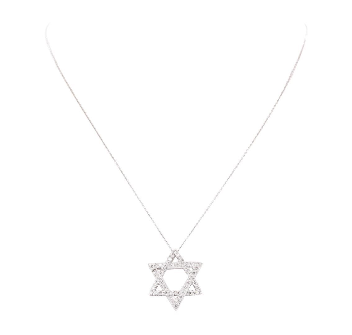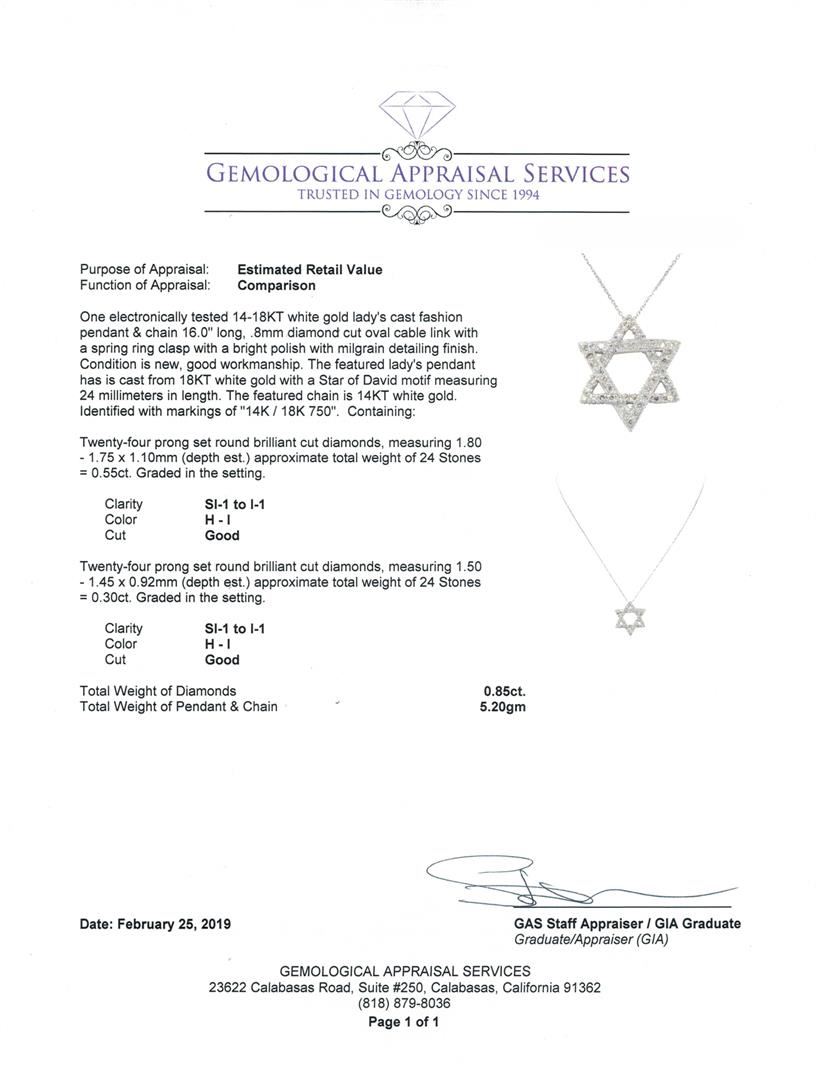 One electronically tested 14-18KT white gold lady's cast fashion pendant & chain 16.0' long,.8mm diamond cut oval cable link with a spring ring clasp with a bright polish with milgrain detailing finish. The featured lady's pendant has is cast from 18KT white gold with a Star of David motif measuring 24 millimeters in length. The featured chain is 14KT white gold. Identified with markings of '14K / 18K 750'. Condition is new, good workmanship. Containing: Twenty-Four prong set round brilliant cut diamonds, measuring 1.80 - 1.75 x 1.10mm (depth est.) approximate total weight of 24 Stones = 0.55ct. Graded in the setting. Color H - I, Clarity SI-1 to I-1, Cut Good Twenty-Four prong set round brilliant cut diamonds, measuring 1.50 - 1.45 x 0.92mm (depth est.) approximate total weight of 24 Stones = 0.30ct. Graded in the setting. Color H - I, Clarity SI-1 to I-1, Cut Good. Total Weight of Diamonds 0.85ct. Total Weight of Pendant & Chain 5.20gm. GAS Appraised.