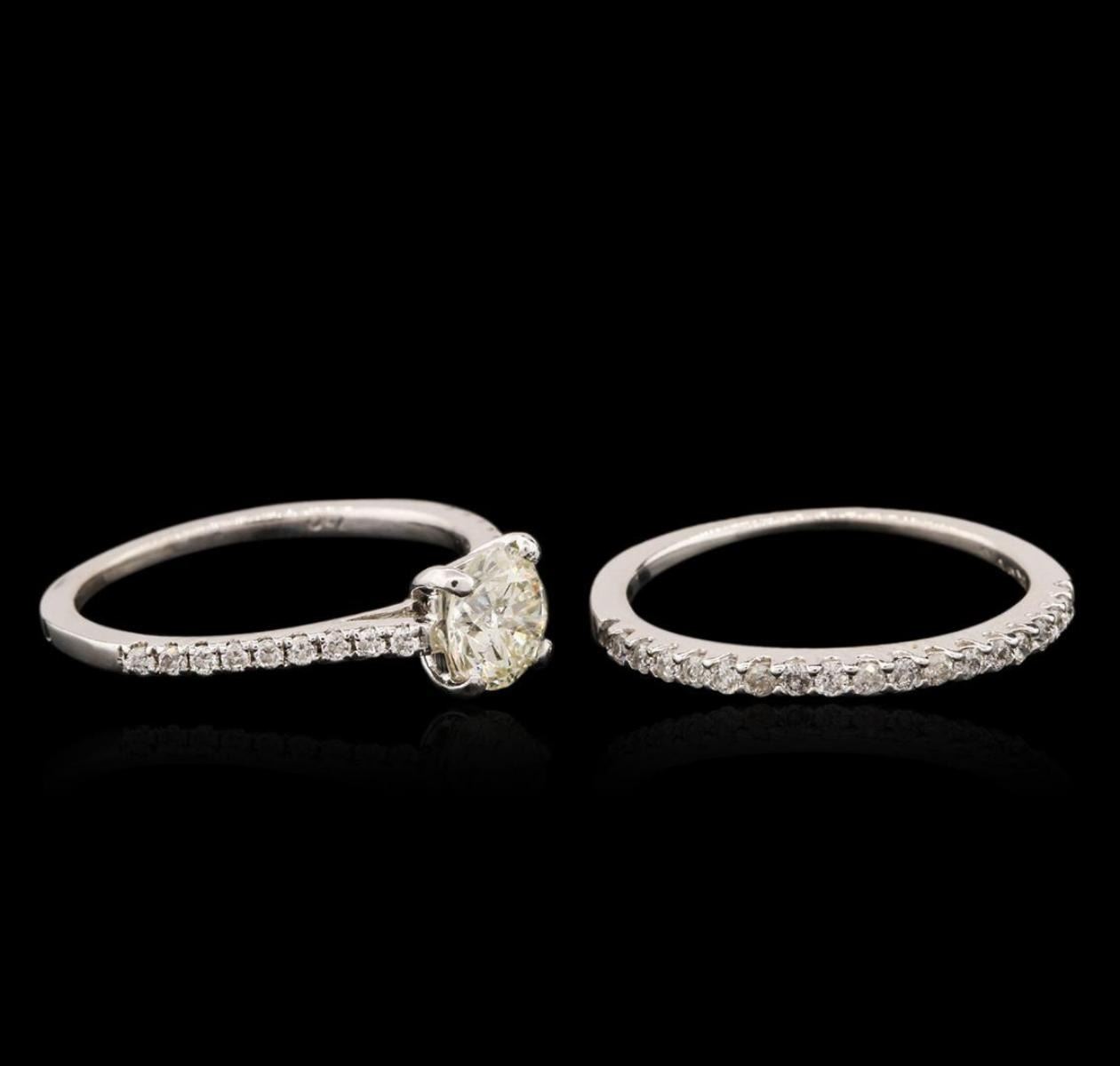One electronically tested 18KT and 14KT white gold ladies cast diamond wedding set. The wedding set consists of a diamond engagement ring and a diamond wedding band. The 18KT white gold engagement features a diamond supported by diamond set shoulders, completed by a one millimeter wide band. The 14KT white gold diamond wedding band is completed by a one millimeter wide band. Bright polish finish. Identified with markings of "18K 14K". Condition is good. Containing: One prong set round brilliant cut diamond, measuring 5.60 - 5.55 x 3.60mm (depth est.) approximate weight of 0.78ct with a medium blue fluorescence. Graded in the setting. Clarity: I-1. Color: L. Depth 64.6%. Table 59.3%. Thirty-Seven prong set round brilliant cut diamonds, measuring 1.30 - 1.20 x 0.75mm (depth est.) approximate total weight of 37 Stones = 0.30ct. Graded in the setting. Clarity: SI-2 to I-2. Color: G - I. Total Weight of Diamonds 1.08ct. Total Weight of Wedding Set 3.05 grams. AIG Appraised.