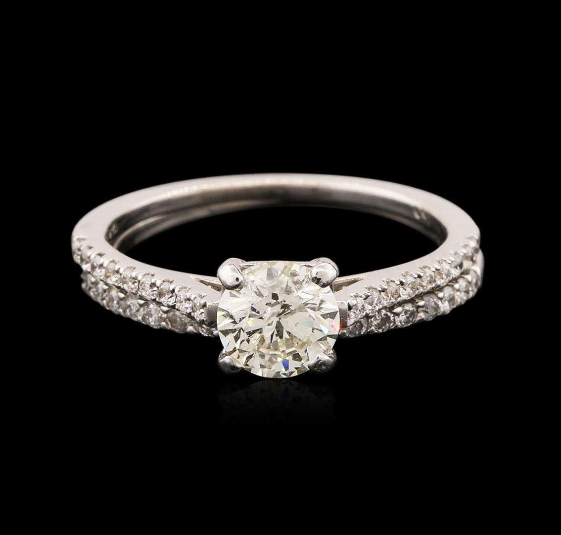One electronically tested 18KT and 14KT white gold ladies cast diamond wedding set. The wedding set consists of a diamond engagement ring and a diamond wedding band. The 18KT white gold engagement features a diamond supported by diamond set shoulders, completed by a one millimeter wide band. The 14KT white gold diamond wedding band is completed by a one millimeter wide band. Bright polish finish. Identified with markings of "18K 14K". Condition is good. Containing: One prong set round brilliant cut diamond, measuring 5.60 - 5.55 x 3.60mm (depth est.) approximate weight of 0.78ct with a medium blue fluorescence. Graded in the setting. Clarity: I-1. Color: L. Depth 64.6%. Table 59.3%. Thirty-Seven prong set round brilliant cut diamonds, measuring 1.30 - 1.20 x 0.75mm (depth est.) approximate total weight of 37 Stones = 0.30 ct. Graded in the setting. Clarity: SI-2 to I-2. Color: G - I. Total Weight of Diamonds 1.08ct. Total Weight of Wedding Set 3.05 grams. AIG Appraised.