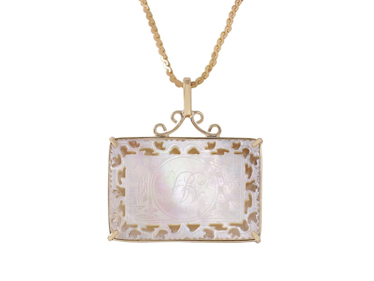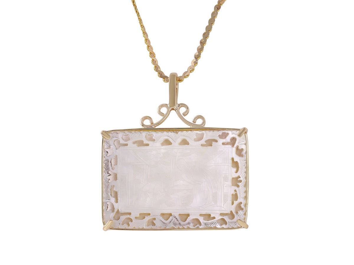 One electronically tested 14-18KT yellow gold ladies hand made vintage mother of pearl "Small Gambling Chip" pendant & chain 17.0" long, with a spring ring clasp with a bright polish finish. Pendant is 14K gold, chain is 18K gold. Pendant Dimensions: 1.20 inches x 0.82 inch. Identified with markings of "K18". Condition is very good. Total Weight of Pendant & Chain 7.63gm. The descriptions listed should not be construed as an appraisal. The detail is provided as a guideline for color, clarity, weights and measurements to the best of our ability. We welcome inspections. WE SHIP WORLDWIDE!