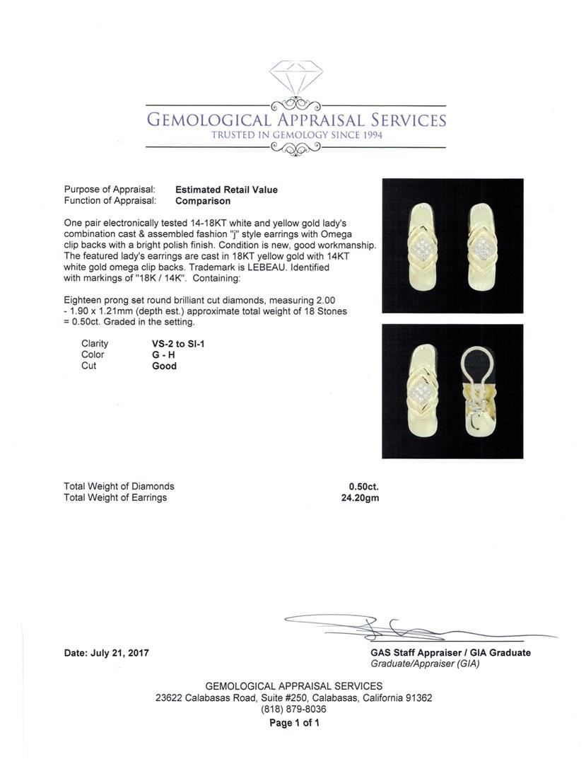 One pair electronically tested 14-18KT white and yellow gold Ladies combination cast & assembled fashion 'j' style earrings with Omega clip backs with a bright polish finish. The featured Ladies earrings are cast in 18KT yellow gold with 14KT white gold omega clip backs. Trademark is LEBEAU. Identified with markings of '18K / 14K'. Condition is new, good workmanship. Containing: Eighteen prong set round brilliant cut diamonds, measuring 2.00 - 1.90 x 1.21mm (depth est.) approximate total weight of 18 Stones = 0.50ct. Graded in the setting. Color G - H Clarity VS-2 to SI-1 Cut Good. Total Weight of Diamonds 0.50ct. Total Weight of Earrings 24.20gm. GAS Appraised.