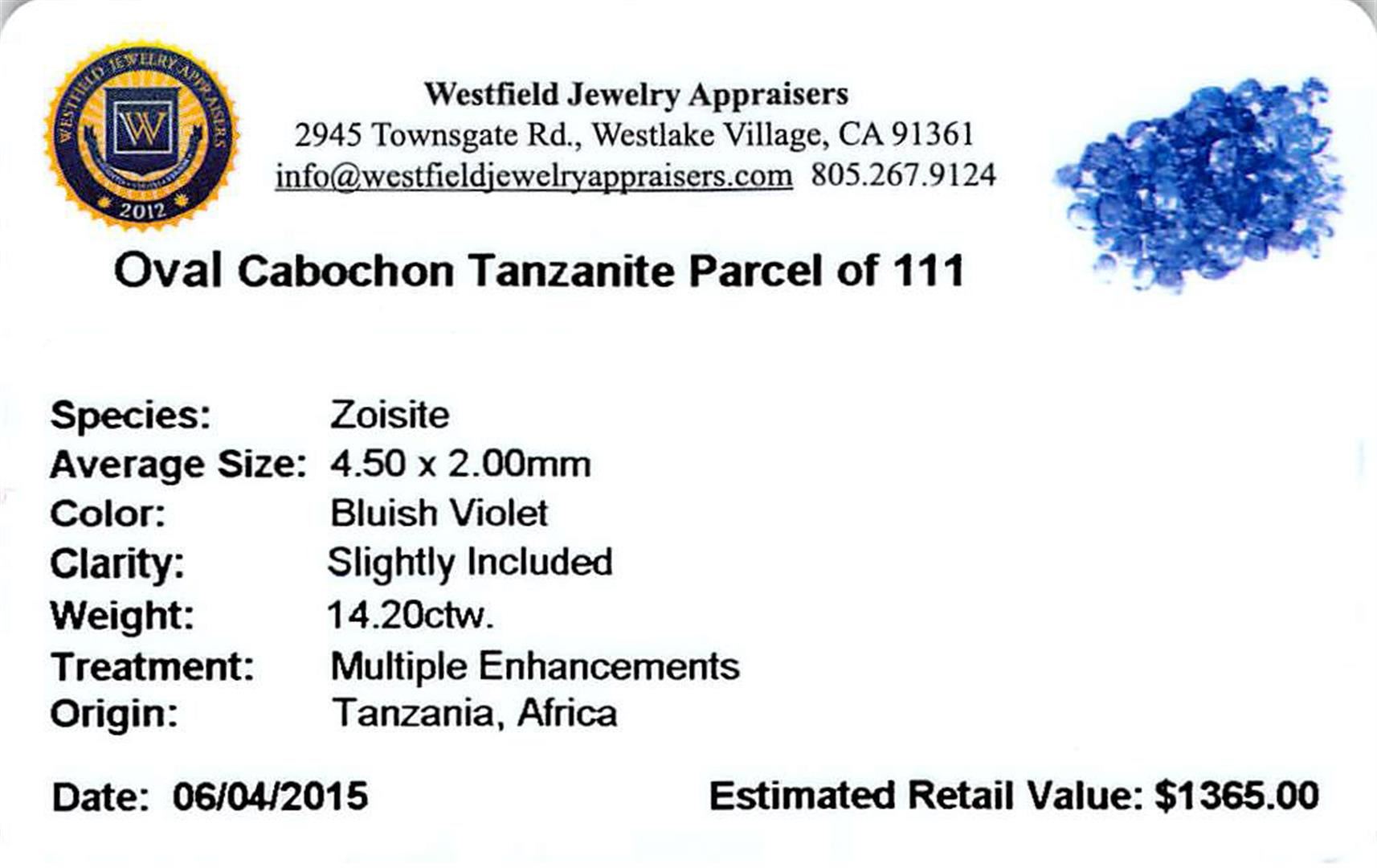 One hundred eleven oval mixed cut natural tanzanites, measuring 4.50 x 2.00 x 1.30mm, exact total weight 14.20ct., clarity is slightly included, type I, medium, very slightly grayish, bluish violet color, (GIA bV 5/3), cut is good. Transmitting light with a minimum of distortion, transparent, Naturally occurring internal & external characteristics are present. Measurements & the color grade are an average for the group. Tanzanite is a very rare gemstone that is only found in the country of Tanzania. Originally discovered in 1967. Tiffany & Company, named the stone Tanzanite. It is found in the Usumburu Mountains that border the Umba Valley of northern Tanzania. Tanzanite occurs in gray, brown, violet, blue, reddish-purple, & green. The gem is interesting because of its exceptional pleochroism. Rotated in different directions a tanzanite will exhibit multiple changes of color. Tanzanite has a low tolerance to ultrasonic cleaning, and should not be cleaned using this method. Westfield Appraised at $1,365.00.