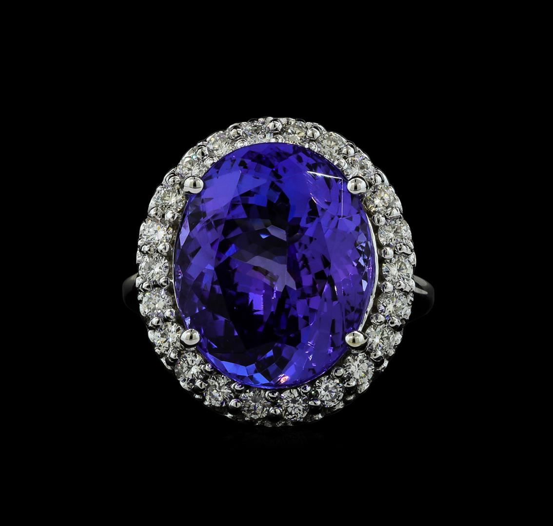 One electronically tested 14KT white gold lady's cast fashion ring with a basket halo with a bright polish finish. The featured lady's ring has a shank measuring 2.53 millimeters wide. Identified with markings of '14K'. Condition is new, good workmanship. Containing: One prong set oval modified brilliant cut natural tanzanite, measuring 16.77 x 13.45 x 8.64mm, (depth est.) 3%. bulge factor, approximate weight of 14.20ct., clarity is eye clean, medium light, very slightly grayish, violet color, (GIA V 4/3), cut is very good. Transmitting light with no distortion, transparent. Colored gemstones are presumed to have been subjected to commonly used enhancement processes. Graded in the setting. Twenty-Two prong set round brilliant cut diamonds, measuring 2.25 - 2.15 x 1.36mm (depth est.) approximate total weight of 22 Stones = 0.88ct. Graded in the setting. Clarity SI-1 to I-1. Color: H - I Cut Good. Total Weight of Colored Stones 14.20ct.. Total Weight of Diamonds 0.88ct.. Total Weight of Ring 10.40gm GAS Appraised at $15,970.00.