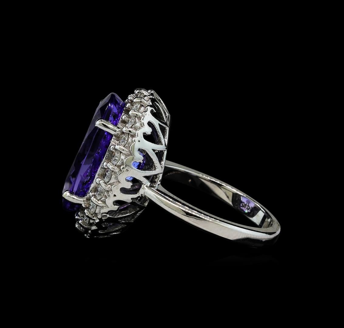 One electronically tested 14KT white gold lady's cast fashion ring with a basket halo with a bright polish finish. The featured lady's ring has a shank measuring 2.53 millimeters wide. Identified with markings of '14K'. Condition is new, good workmanship. Containing: One prong set oval modified brilliant cut natural tanzanite, measuring 16.77 x 13.45 x 8.64mm, (depth est.) 3%. bulge factor, approximate weight of 14.20ct., clarity is eye clean, medium light, very slightly grayish, violet color, (GIA V 4/3), cut is very good. Transmitting light with no distortion, transparent. Colored gemstones are presumed to have been subjected to commonly used enhancement processes. Graded in the setting. Twenty-Two prong set round brilliant cut diamonds, measuring 2.25 - 2.15 x 1.36mm (depth est.) approximate total weight of 22 Stones = 0.88ct. Graded in the setting. Clarity SI-1 to I-1. Color: H - I Cut Good. Total Weight of Colored Stones 14.20ct.. Total Weight of Diamonds 0.88ct.. Total Weight of Ring 10.40gm GAS Appraised at $15,970.00.