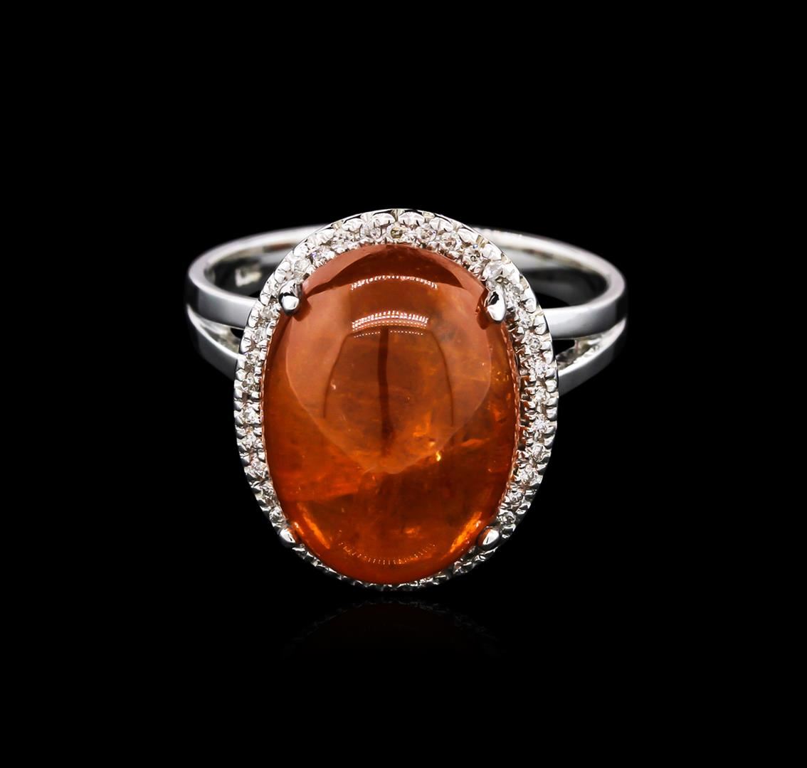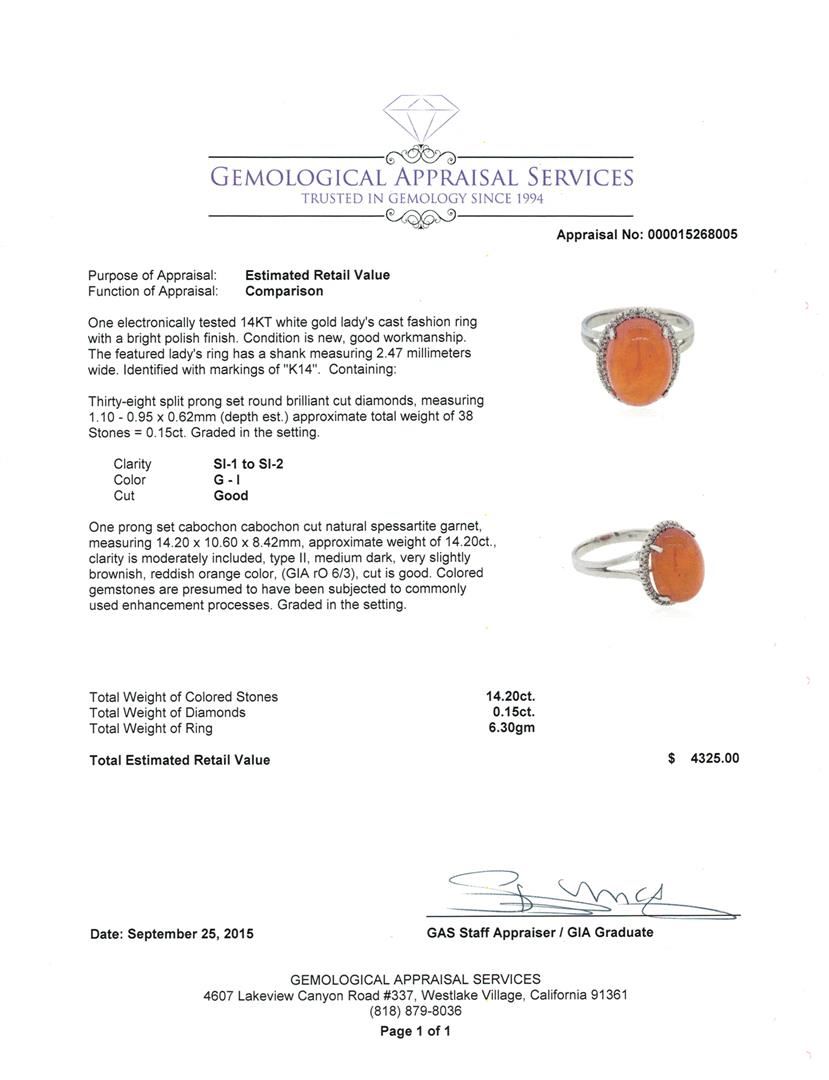 One electronically tested 14KT white gold lady's cast fashion ring with a bright polish finish. The featured lady's ring has a shank measuring 2.47 millimeters wide. Identified with markings of "K14". Condition is new, good workmanship. Containing: Thirty-Eight split prong set round brilliant cut diamonds, measuring 1.10 - 0.95 x 0.62mm (depth est.) approximate total weight of 38 Stones = 0.15ct. Graded in the setting. Clarity: SI-1 to SI-2. Color: G - I. Cut Good One prong set cabochon cabochon cut natural spessartite garnet, measuring 14.20 x 10.60 x 8.42mm, approximate weight of 14.20ct., clarity is moderately included, type II, medium dark, very slightly brownish, reddish orange color, (GIA rO 6/3), cut is good. Colored gemstones are presumed to have been subjected to commonly used enhancement processes. Graded in the setting. Total Weight of Colored Stones 14.20ct. Total Weight of Diamonds 0.15ct. Total Weight of Ring 6.30gm at $4325.00.. GAS Appraised at $4,325.00.
