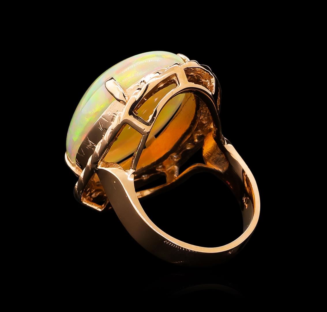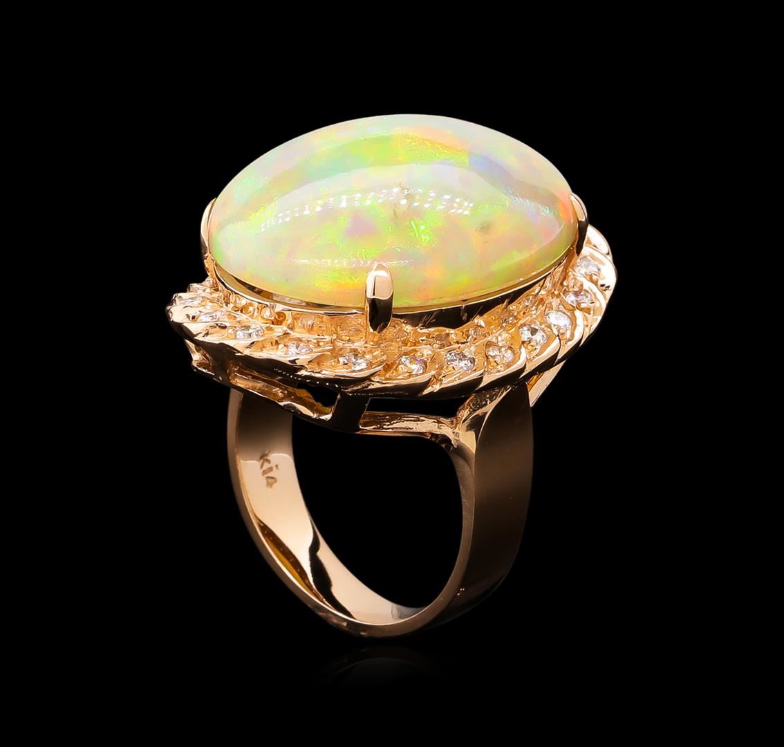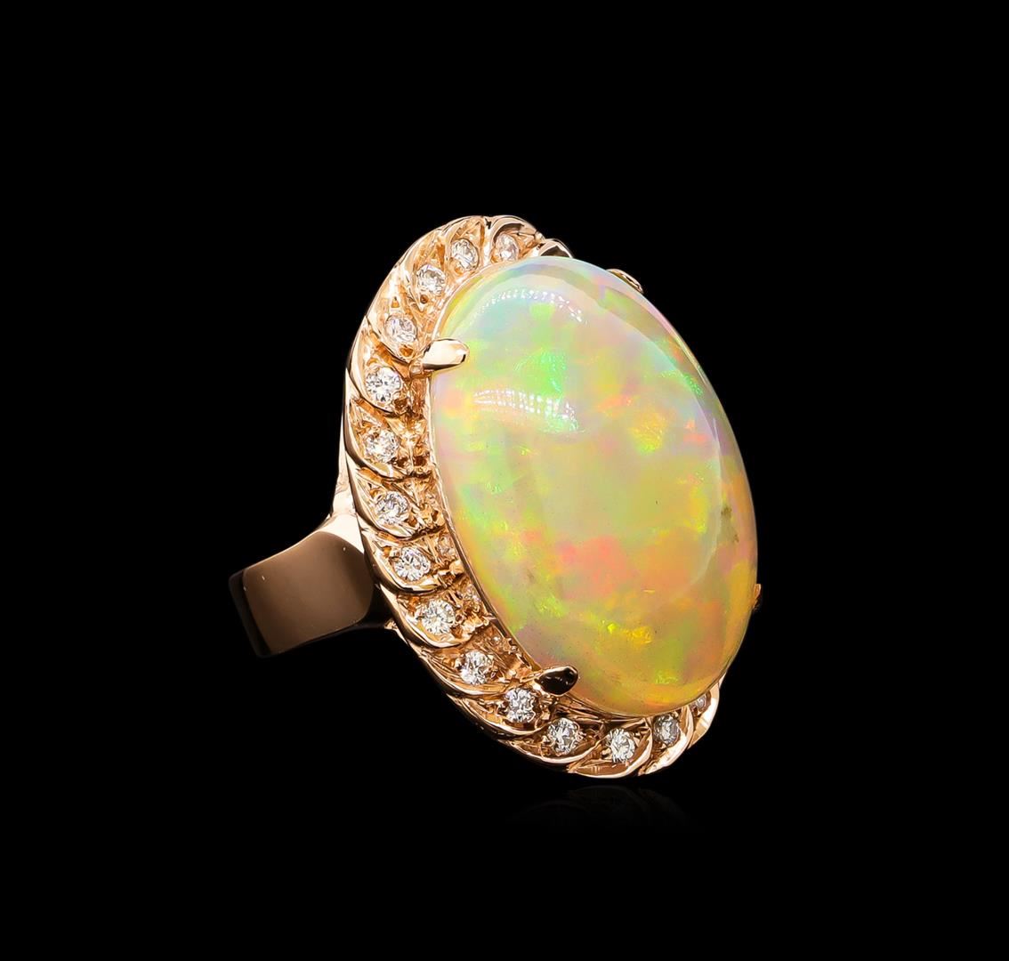 One electronically tested 14KT rose gold lady's cast fashion ring with a halo with a bright polish finish. The featured lady's ring has a shank measuring 3.96 millimeters wide. Identified with markings of "K14". Condition is new, good workmanship. Containing: One semi crystal opal that is cut in a oval shaped cabochon and is prong set, measuring 24.10 mm long x 17.94 mm wide, and 7.65 mm thick and the approximate weight is 14.22 carats. The opal has a very bright, red multicolor play of color (fire) in a rolling flashfire pattern; a medium dome; a good cut; slightly included; consistent in its brightness and pattern; and is not directional. Graded in the setting. Twenty-Three prong set round brilliant cut diamonds, measuring 1.85 - 1.75 x 1.08mm (depth est.) approximate total weight of 23 Stones = 0.49ct. Graded in the setting. Clarity: SI-1 to SI-2. Color: G - H. Cut Good. Total Weight of Diamonds 0.49ct. Total Weight of Opals 14.22ct. Total Weight of Ring 11.90gm. GAS Appraised at $10,370.00.