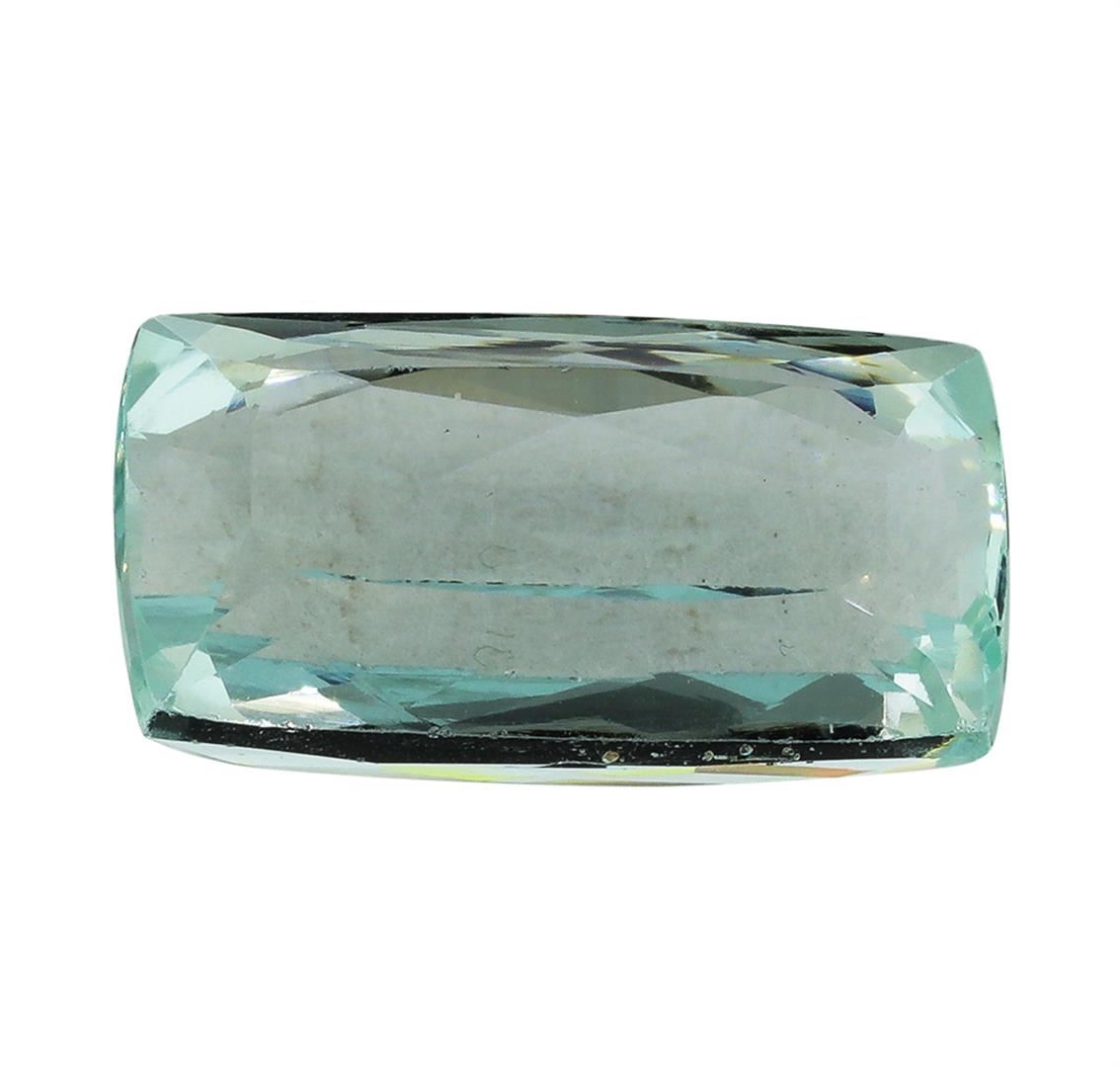 One natural cushion cut aquamarine with an exact weight of 14.23ct., clarity is eye clean, greenish blue, light. Gemological Appraisals Services estimates the retail value at $5478.55 GAS Appraised.