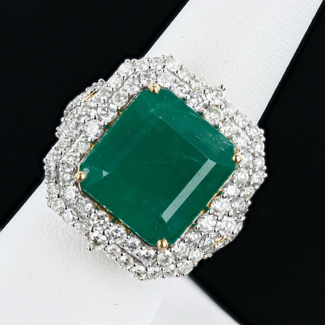 One polished, stamped, and tested 18K yellow gold ring marked Oscar Friedman. The ring is mounted with 1 genuine emerald center stone weighing approximately 14.24 carat, and 112 genuine round diamonds weighing approximately 2.38 carats. This item weighs 11.8 grams, condition is new, excellent workmanship. #MAIN GEMSTONE# Species: Natural Beryl Variety: Emerald Shape: Octagonal Cutting Style: Step Cut Measurements: 15.0 x 13.5 x 8.9mm Weight: 14.24 carat Color: Green Cut Grade: Very Good Refractive Index: 1.564 - 1.595 DR Birefringence: 0.005 to 0.009 Hardness: 7.5 - 8 #ADJACENT GEMSTONES ON RING# Identity: Natural Diamond Shape: Round Cutting Style: Brilliant Cut Quantity: 112 Diamonds Measurements: 1.2 - 2.1mm Total Weight: 2.38 carats Color Grade: G-H Clarity Grade: SI1-SI2 Refractive Index: 2.417 Hardness: 10 EMERALD WEIGHT: 14.24 ct TOTAL DIAMOND WEIGHT: 2.38 cts WEIGHT OF ITEM: 11.8 grams GOLD CONTENT: 18K Yellow Gold Size: 7 1/4
