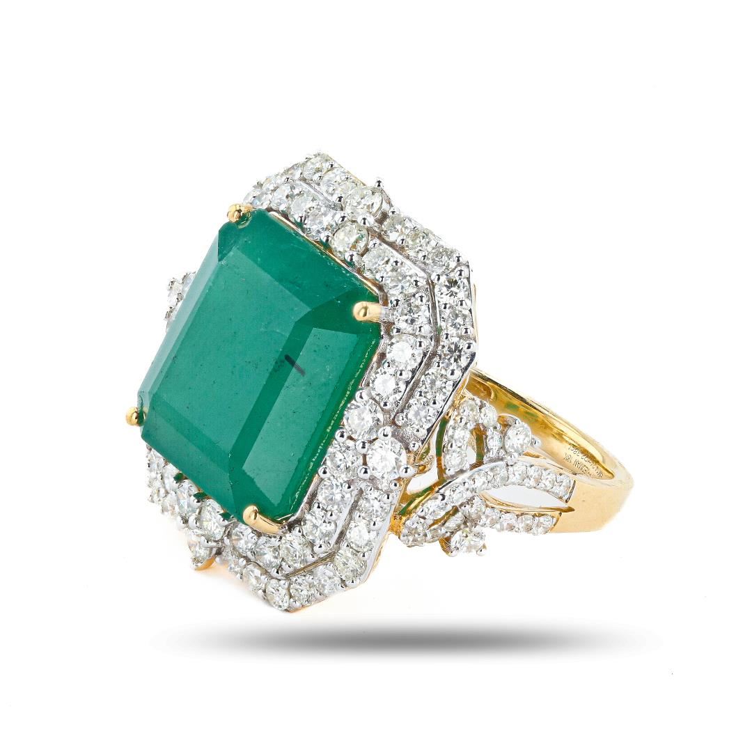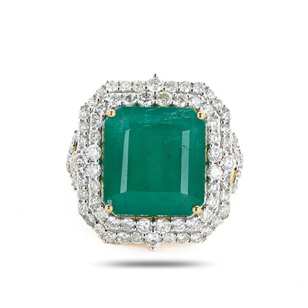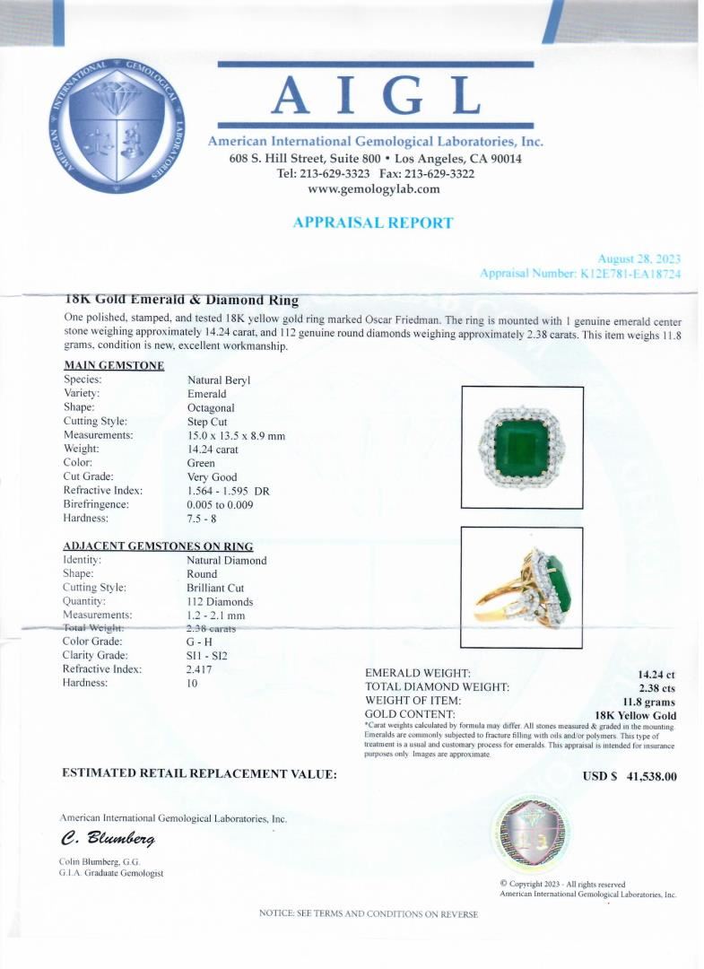 One polished, stamped, and tested 18K yellow gold ring marked Oscar Friedman. The ring is mounted with 1 genuine emerald center stone weighing approximately 14.24 carat, and 112 genuine round diamonds weighing approximately 2.38 carats. This item weighs 11.8 grams, condition is new, excellent workmanship. #MAIN GEMSTONE# Species: Natural Beryl Variety: Emerald Shape: Octagonal Cutting Style: Step Cut Measurements: 15.0 x 13.5 x 8.9mm Weight: 14.24 carat Color: Green Cut Grade: Very Good Refractive Index: 1.564 - 1.595 DR Birefringence: 0.005 to 0.009 Hardness: 7.5 - 8 #ADJACENT GEMSTONES ON RING# Identity: Natural Diamond Shape: Round Cutting Style: Brilliant Cut Quantity: 112 Diamonds Measurements: 1.2 - 2.1mm Total Weight: 2.38 carats Color Grade: G-H Clarity Grade: SI1-SI2 Refractive Index: 2.417 Hardness: 10 EMERALD WEIGHT: 14.24 ct TOTAL DIAMOND WEIGHT: 2.38 cts WEIGHT OF ITEM: 11.8 grams GOLD CONTENT: 18K Yellow Gold Size: 7 1/4