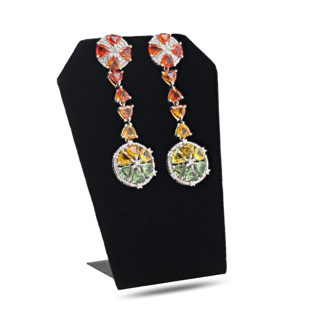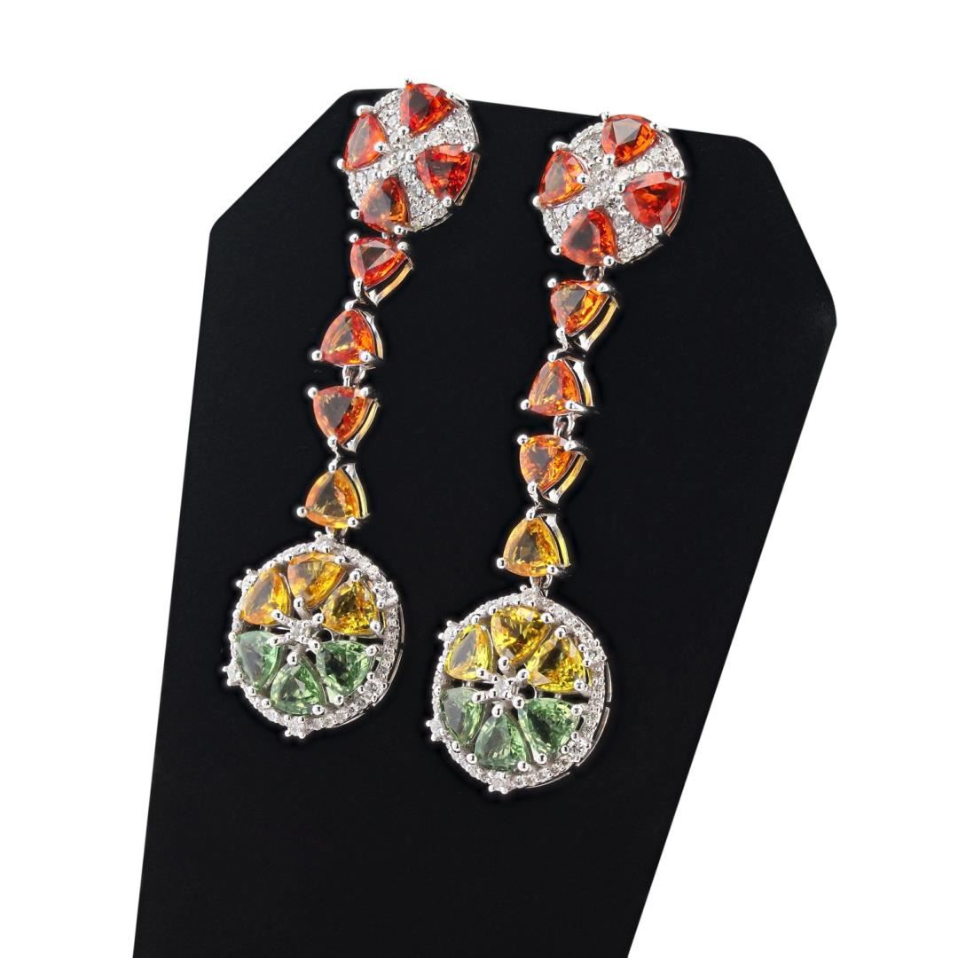 One polished, stamped. and tested pair of platinum earrings with a bright finish. The earrings are mounted with 28 genuine fancy color sapphires weighing approximately 14.27 carats. and 132 genuine round diamonds weighing approximately 1.16 carats. This item weighs 18.5 grams, condition is new, excellent workmanship. #MAIN GEMSTONES# Species: Natural Corundum; Variety: Fancy Color Sapphire; Shape: Triangular Cushion; Cutting Style: Brilliant Cut Crown, Step Cut Pavilion; Quantity: 28 Sapphires; Average Dimensions: 5 x 5mm; Total Weight: 14.27 carats; Color: Green / Yellow / Orange; Cut Grade: Good - Very Good; Refractive Index: 1.762 - 1.770 DR; Birefringence: 0.008 - 0.010; Hardness: 9 #ADJACENT GEMSTONES ON EARRINGS# Identity: Natural Diamond; Shape: Round; Cutting Style: Brilliant Cut; Quantity: 132 Diamonds; Measurements: 1.0 - 1.8mm; Total Weight: 1.16 carats; Clarity Grade: VS2-SI2; Color Grade: G-I; Refractive Index: 2.418; Hardness: 10; TOTAL SAPPHIRE WEIGHT: 14.27 cts; TOTAL DIAMOND WEIGHT: 1.16 cts; WEIGHT OF ITEM: 18.5 grams; METAL: Platinum