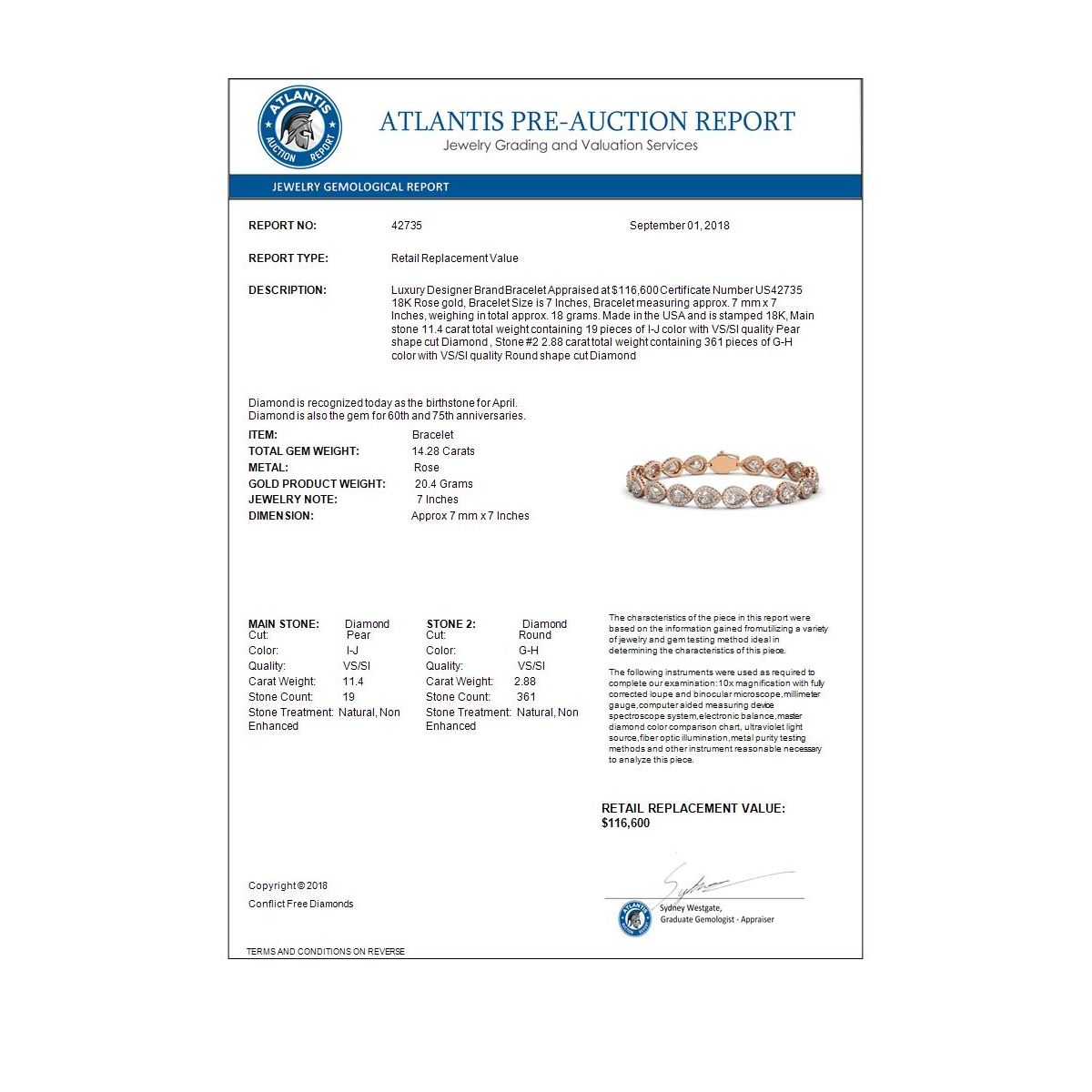 REF-2650M4H -42735 ---- 14.28 CTW Pear Diamond Designer Bracelet 18K Rose Gold ---- Luxury Designer Brand Bracelet Appraised at $116,600 Certificate Number US42735 18K Rose gold, Bracelet Size is 7 Inches, Bracelet measuring approx. 7 mm x 7 Inches, weighing in total approx. 18 grams. Made in the USA and is stamped 18K, Main stone 11.4 carat total weight containing 19 pieces of I-J color with VS/SI quality Pear shape cut Diamond , Stone #2 2.88 carat total weight containing 361 pieces of G-H color with VS/SI quality Round shape cut Diamond