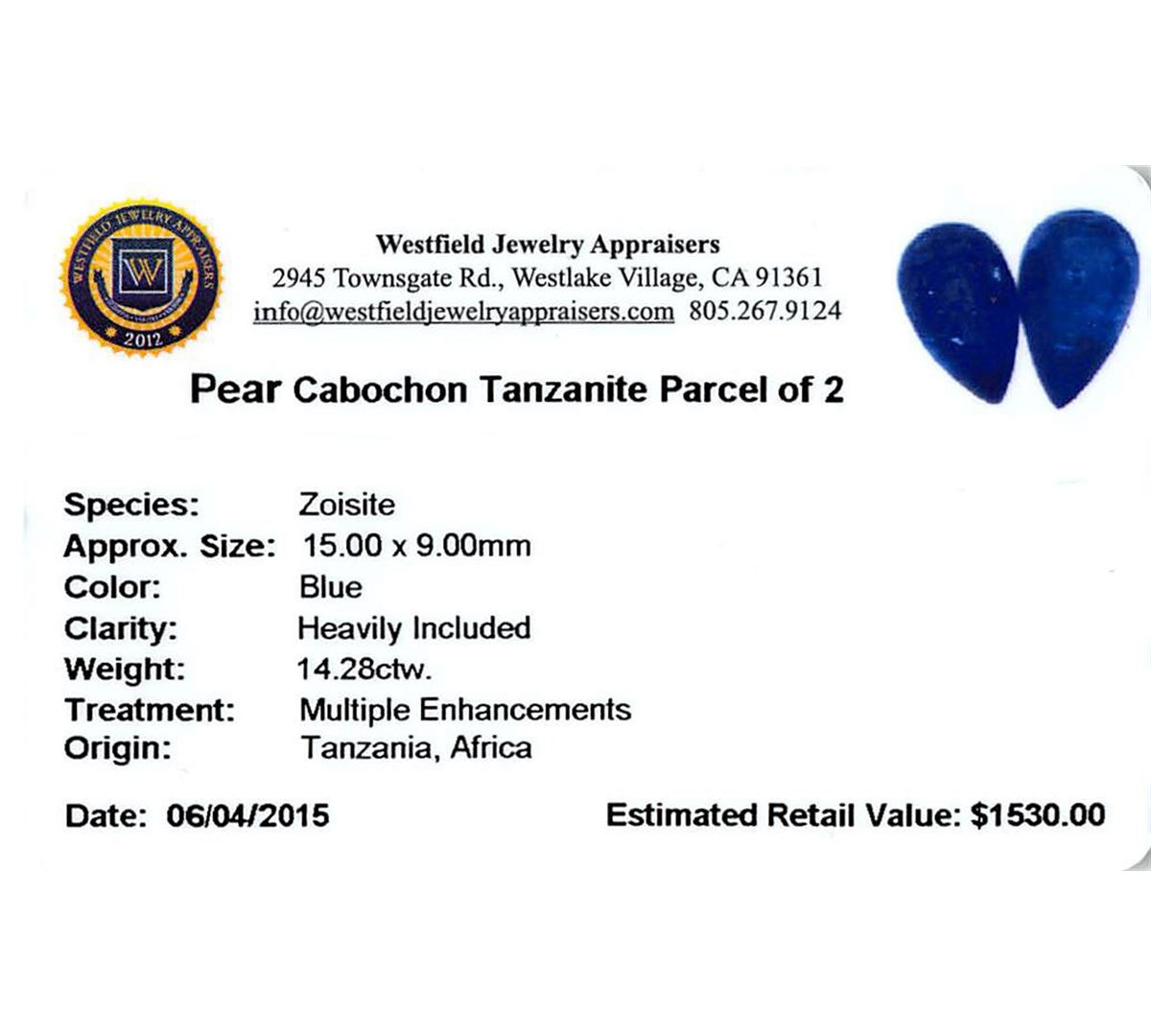 Two pear cabochon cut natural tanzanites, measuring 15.00 x 9.00 x 6.00mm, exact total weight 14.28ct., clarity is heavily included, type I, dark, moderately strong, blue color, (GIA B 7/4), cut is good. Measurements are an average for the pair. Westfield Appraised at $1,530.00.