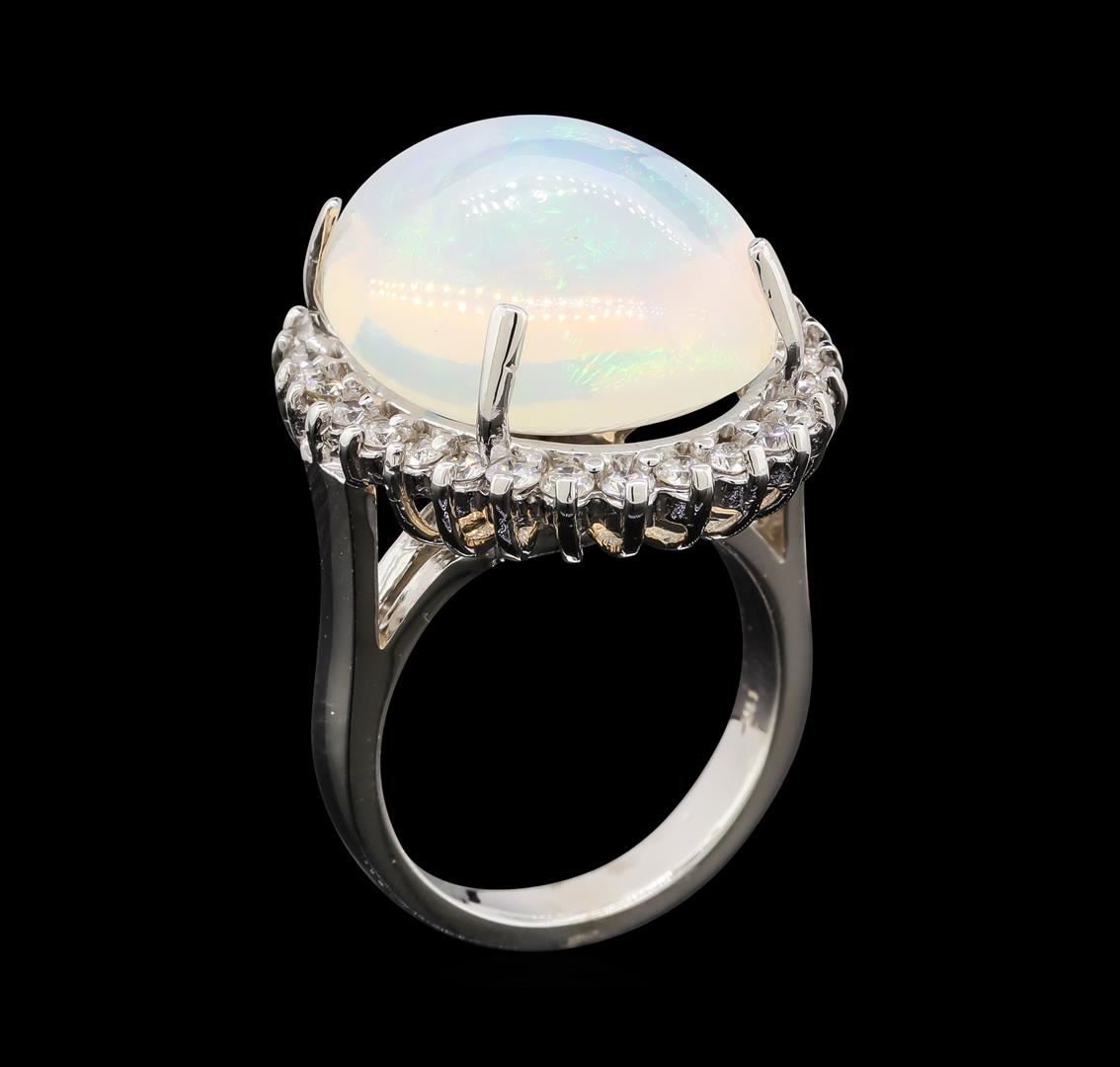 One electronically tested 14KT white gold lady's cast fashion ring with a cathedral shank with a basket halo with a bright polish finish. The featured lady's ring has a shank measuring 3.27 millimeters wide. Identified with markings of '14K'. Condition is new, good workmanship. Containing: One crystal opal that is cut in a oval shaped cabochon and is prong set, measuring 19.53 mm long x 15.95 mm wide, and 9.97 mm thick and the approximate weight is 14.28 carats. The opal has a bright, red multicolor play of color (fire) in a rolling flashfire pattern; a high dome; a good cut; no inclusions; consistent in its brightness and pattern; and is not directional. Graded in the setting. Twenty-Eight prong set round brilliant cut diamonds, measuring 2.10 - 2.00 x 1.23mm (depth est.) approximate total weight of 28 Stones = 0.88ct. Graded in the setting. Clarity SI-1 to I-1. Color: G - H Cut Good. Total Weight of Diamonds 0.88ct.. Total Weight of Opals 14.28ct.. Total Weight of Ring 11.90gm. GAS Appraised at $10,155.00.