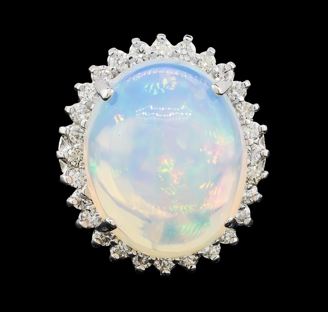 One electronically tested 14KT white gold lady's cast fashion ring with a cathedral shank with a basket halo with a bright polish finish. The featured lady's ring has a shank measuring 3.27 millimeters wide. Identified with markings of '14K'. Condition is new, good workmanship. Containing: One crystal opal that is cut in a oval shaped cabochon and is prong set, measuring 19.53 mm long x 15.95 mm wide, and 9.97 mm thick and the approximate weight is 14.28 carats. The opal has a bright, red multicolor play of color (fire) in a rolling flashfire pattern; a high dome; a good cut; no inclusions; consistent in its brightness and pattern; and is not directional. Graded in the setting. Twenty-Eight prong set round brilliant cut diamonds, measuring 2.10 - 2.00 x 1.23mm (depth est.) approximate total weight of 28 Stones = 0.88ct. Graded in the setting. Clarity SI-1 to I-1. Color: G - H Cut Good. Total Weight of Diamonds 0.88ct.. Total Weight of Opals 14.28ct.. Total Weight of Ring 11.90gm. GAS Appraised at $10,155.00.