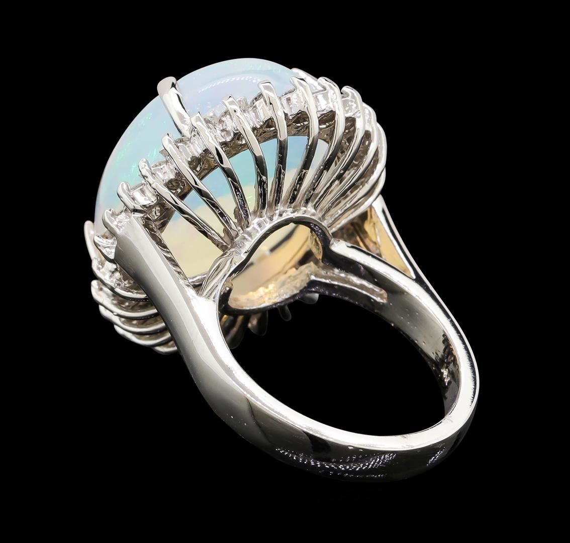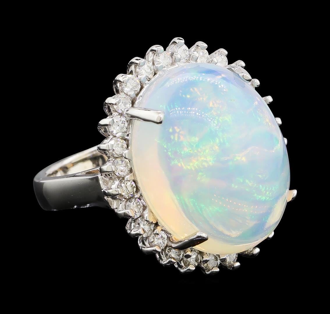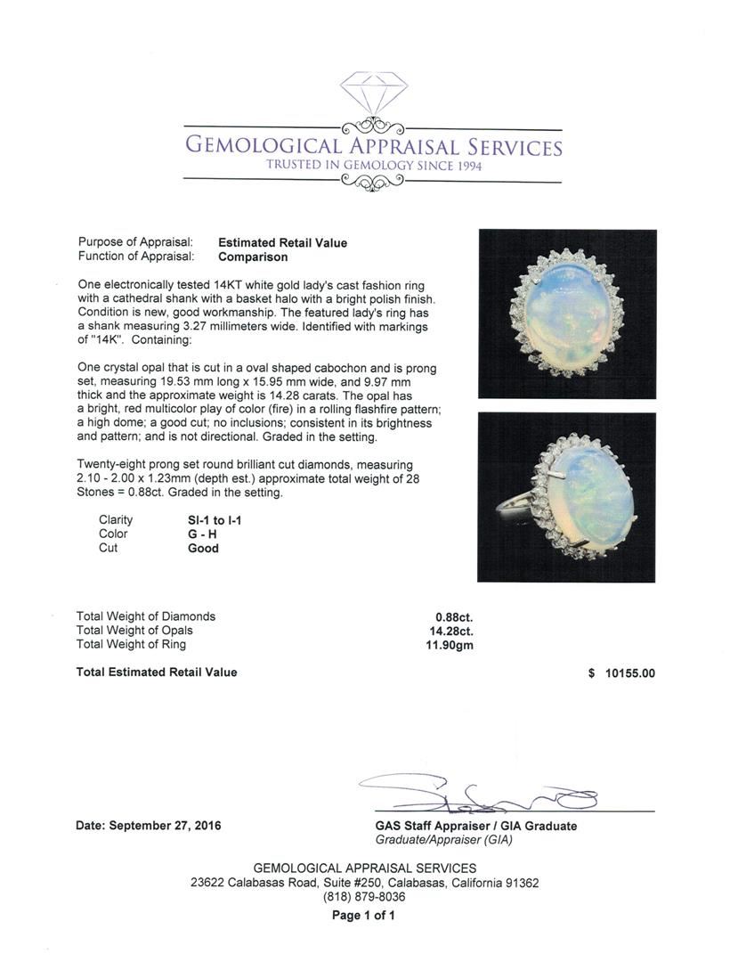 One electronically tested 14KT white gold lady's cast fashion ring with a cathedral shank with a basket halo with a bright polish finish. The featured lady's ring has a shank measuring 3.27 millimeters wide. Identified with markings of '14K'. Condition is new, good workmanship. Containing: One crystal opal that is cut in a oval shaped cabochon and is prong set, measuring 19.53 mm long x 15.95 mm wide, and 9.97 mm thick and the approximate weight is 14.28 carats. The opal has a bright, red multicolor play of color (fire) in a rolling flashfire pattern; a high dome; a good cut; no inclusions; consistent in its brightness and pattern; and is not directional. Graded in the setting. Twenty-Eight prong set round brilliant cut diamonds, measuring 2.10 - 2.00 x 1.23mm (depth est.) approximate total weight of 28 Stones = 0.88ct. Graded in the setting. Clarity SI-1 to I-1. Color: G - H Cut Good. Total Weight of Diamonds 0.88ct.. Total Weight of Opals 14.28ct.. Total Weight of Ring 11.90gm. GAS Appraised at $10,155.00.