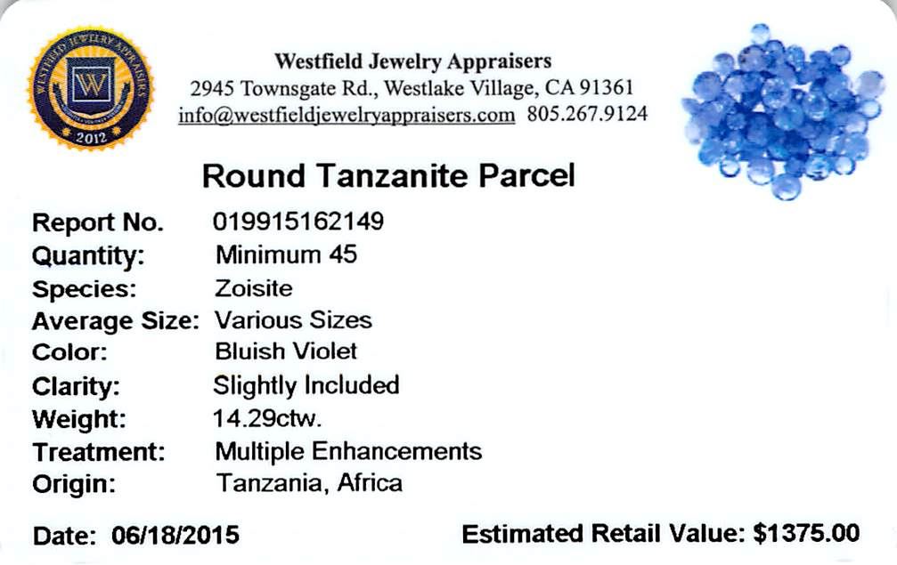 Forty-five round mixed cut natural tanzanites exact total weight 14.29ct., clarity is slightly included, type I, medium dark, very slightly grayish, bluish violet color, (GIA bV 6/3), cut is good. Transmitting light with a minimum of distortion, transparent. Naturally occurring internal & external characteristics are present. Color grade is an average for the group. Tanzanite is a very rare gemstone that is only found in the country of Tanzania. Originally discovered in 1967. Tiffany & Company, named the stone Tanzanite. It is found in the Usumburu Mountains that border the Umba Valley of northern Tanzania. Tanzanite occurs in gray, brown, violet, blue, reddish-purple, & green. The gem is interesting because of its exceptional pleochroism. Rotated in different directions a tanzanite will exhibit multiple changes of color. Tanzanite has a low tolerance to ultrasonic cleaning, and should not be cleaned using this method. Westfield Appraised at $1,375.00.