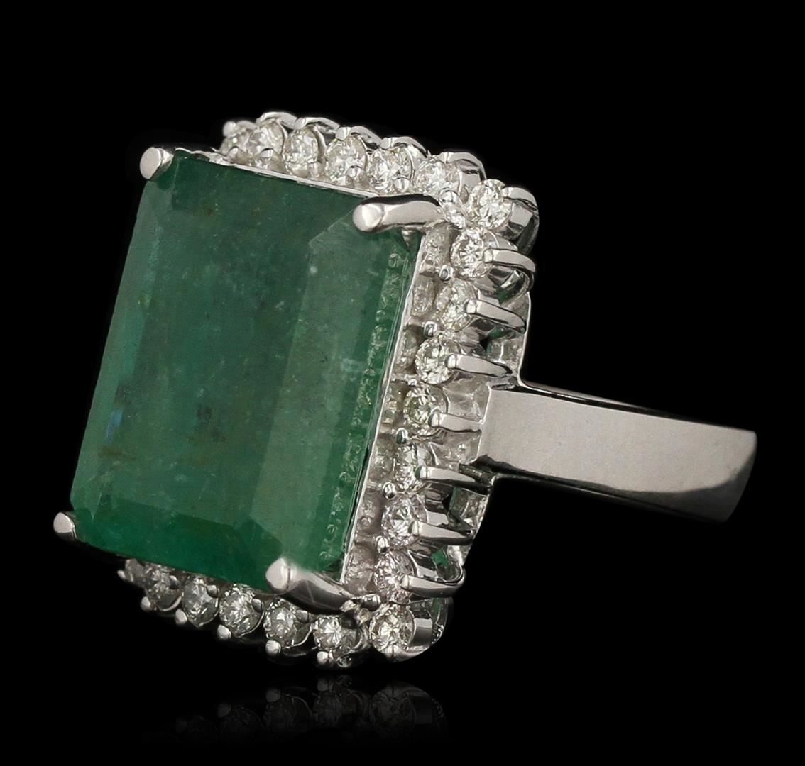 One electronically tested 14KT white gold ladies cast emerald and diamond ring with a bright polish finish. Condition is new, good workmanship. The featured emerald is set within a diamond bezel, completed by a three and one-half millimeter wide band. Identified with markings of "K14". Containing: One prong set rectangular step cut natural emerald, measuring 15.30 x 12.00 x 8.85mm, 8% bulge factor, approximate weight of 14.32ct., clarity is heavily included, type III, medium dark, very slightly grayish, very slightly bluish green color, (GIA vslbG 6/3), cut is good. Transmitting light with a minimum of distortion, transparent to translucent. Naturally occurring internal & external characteristics are present. Indications of oil residue. Graded in the setting. The ring also contains Twenty-eight prong set round brilliant cut diamonds, measuring 2.00 - 1.90 x 1.17mm (depth est.) approximate total weight of 28 Stones = 0.86ct. Graded in the setting. Clarity: SI-2 to I-1. Color: G-I. Total Weight of Colored Stones 14.32ct. Total Weight of Diamonds 0.86ct. Total Weight of Ring: 10.80gm. AIG Appraised at $30,335.00.