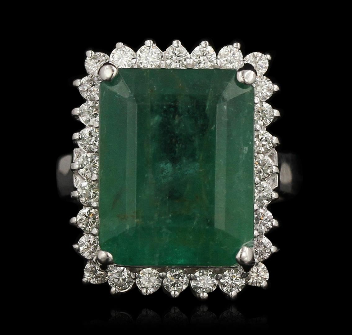 One electronically tested 14KT white gold ladies cast emerald and diamond ring with a bright polish finish. Condition is new, good workmanship. The featured emerald is set within a diamond bezel, completed by a three and one-half millimeter wide band. Identified with markings of "K14". Containing: One prong set rectangular step cut natural emerald, measuring 15.30 x 12.00 x 8.85mm, 8% bulge factor, approximate weight of 14.32ct., clarity is heavily included, type III, medium dark, very slightly grayish, very slightly bluish green color, (GIA vslbG 6/3), cut is good. Transmitting light with a minimum of distortion, transparent to translucent. Naturally occurring internal & external characteristics are present. Indications of oil residue. Graded in the setting. The ring also contains Twenty-eight prong set round brilliant cut diamonds, measuring 2.00 - 1.90 x 1.17mm (depth est.) approximate total weight of 28 Stones = 0.86ct. Graded in the setting. Clarity: SI-2 to I-1. Color: G-I. Total Weight of Colored Stones 14.32ct. Total Weight of Diamonds 0.86ct. Total Weight of Ring: 10.80gm. AIG Appraised at $30,335.00.