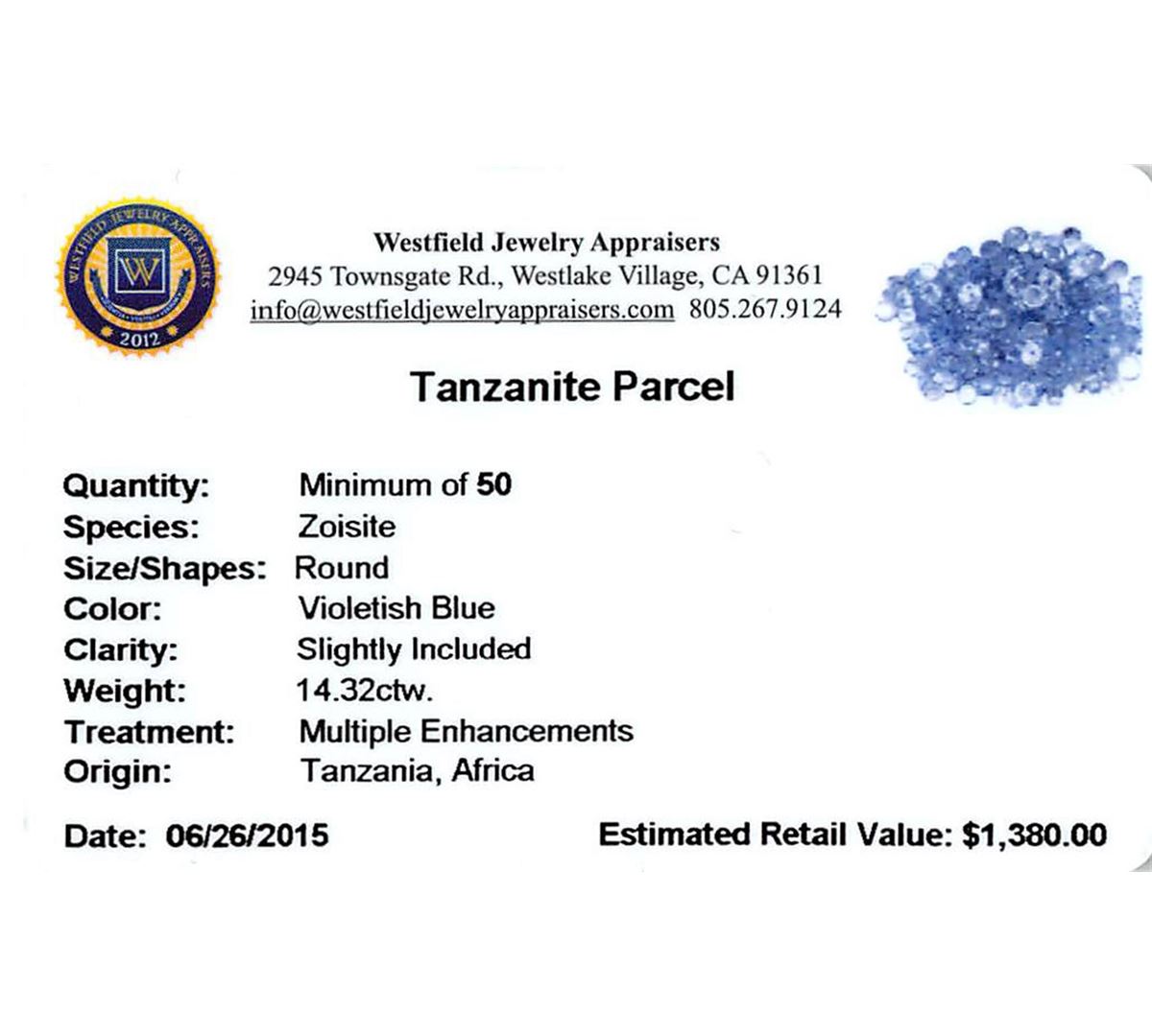 Fifty round mixed cut natural tanzanites, measuring 2.00 - 2.00 x 1.30 mm, exact total weight 14.32ct., clarity is slightly included, type I, medium, very slightly grayish, violetish blue color, (GIA vB 5/3), cut is good. Measurements & the color grade are an average for the group, Color grade is an average for the group, Transmitting light with no distortion, transparent, Naturally occurring internal & external characteristics are present, Indications of multiple laboratory enhancements, including high temperature heat treatment. Westfield Appraised at $1,380.00.
