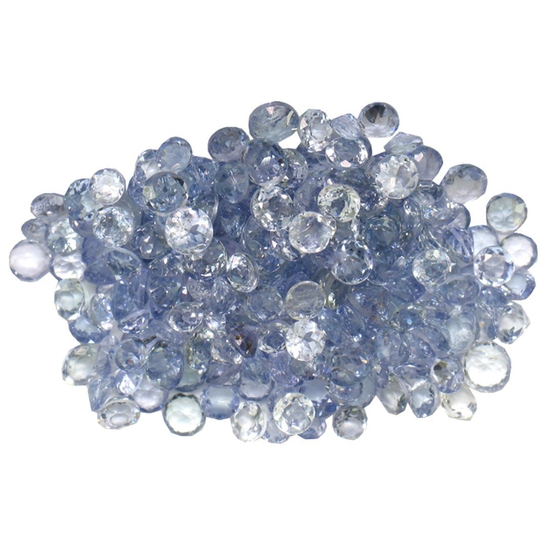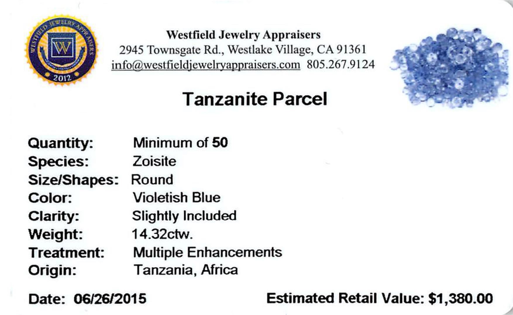 Fifty round mixed cut natural tanzanites, measuring 2.00 - 2.00 x 1.30 mm, exact total weight 14.32ct., clarity is slightly included, type I, medium, very slightly grayish, violetish blue color, (GIA vB 5/3), cut is good. Measurements & the color grade are an average for the group, Color grade is an average for the group, Transmitting light with no distortion, transparent, Naturally occurring internal & external characteristics are present, Indications of multiple laboratory enhancements, including high temperature heat treatment. Westfield Appraised at $1,380.00.