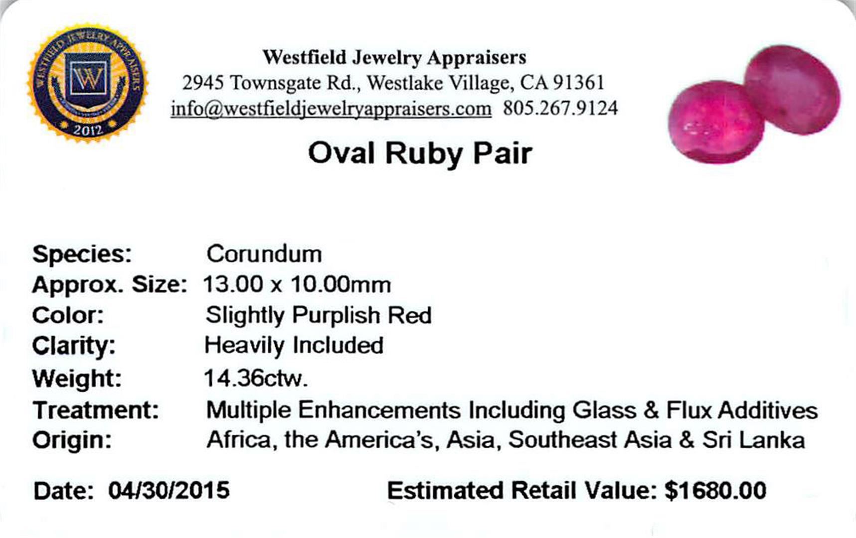 Two oval mixed cut natural rubies, measuring 13.00 x 10.40 x 6.76mm, approximate total weight of 14.36ct., clarity is heavily included, type II, medium dark, very slightly brownish, slightly purplish red color, (GIA slpR 6/3), cut is good. Transmitting light somewhat diffusely, translucent. Naturally occurring internal & external characteristics are present. Indications of laboratory high temperature heat treatment, with glass & flux additives. Ruby has a low tolerance to rhodium plating, repolishing the surface, & ultrasonic cleaning. Westfield Appraised at $1,680.00.