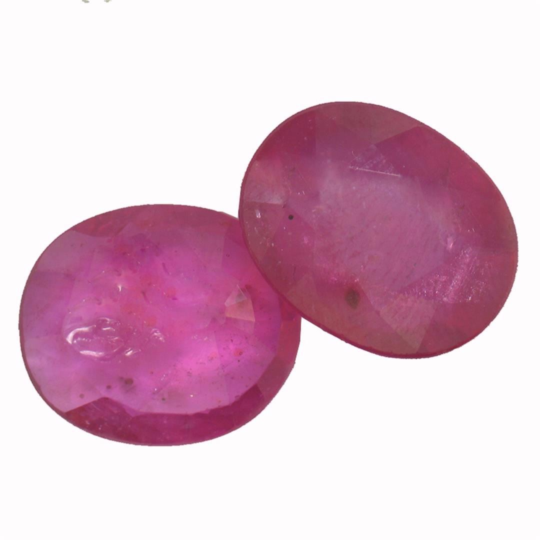 Two oval mixed cut natural rubies, measuring 13.00 x 10.40 x 6.76mm, approximate total weight of 14.36ct., clarity is heavily included, type II, medium dark, very slightly brownish, slightly purplish red color, (GIA slpR 6/3), cut is good. Transmitting light somewhat diffusely, translucent. Naturally occurring internal & external characteristics are present. Indications of laboratory high temperature heat treatment, with glass & flux additives. Ruby has a low tolerance to rhodium plating, repolishing the surface, & ultrasonic cleaning. Westfield Appraised at $1,680.00.