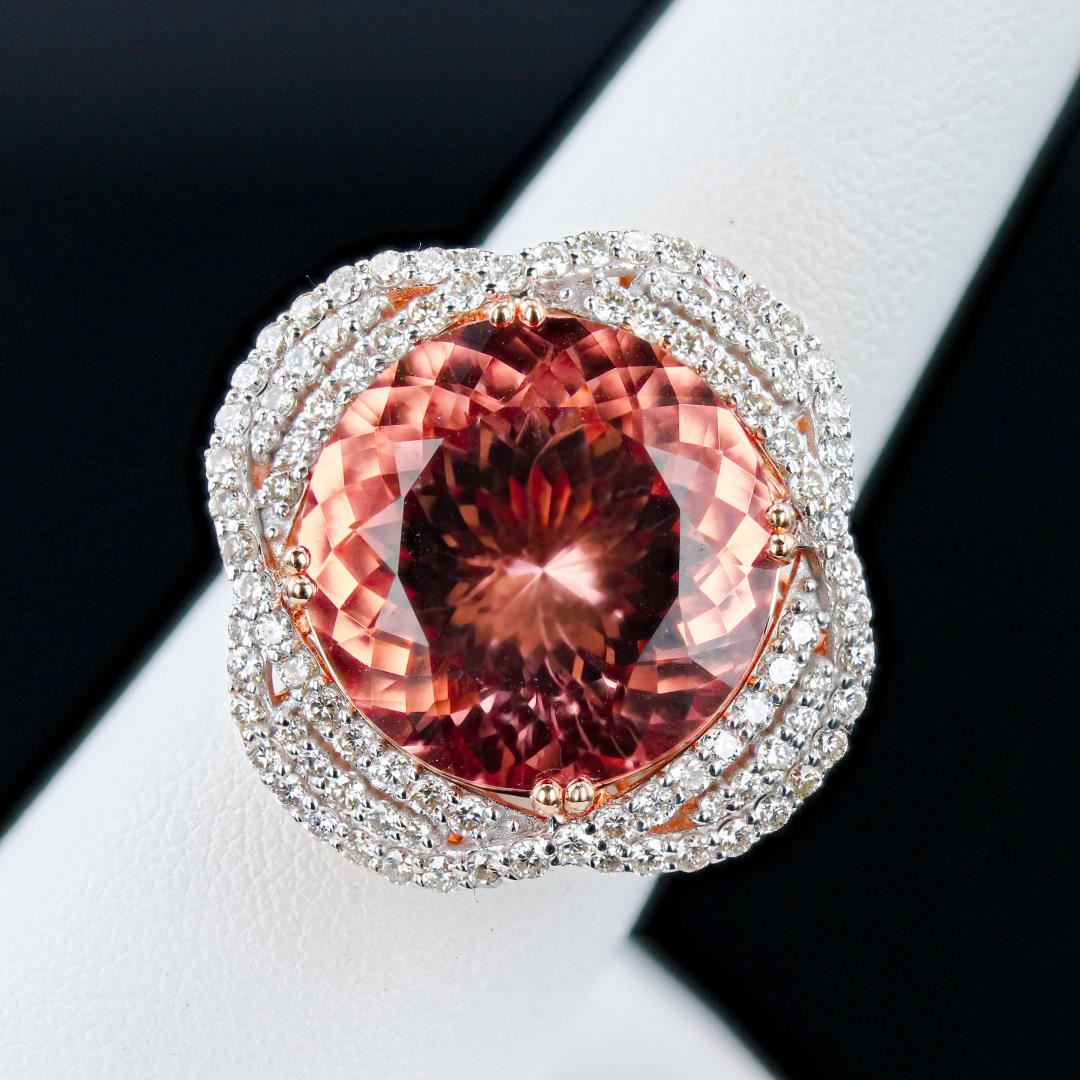 Fourteen karat (14K) two tone gold natural morganite beryl and diamond ring. A round brilliant cut natural morganite beryl gemstone is mounted in the center of the ring. Round brilliant cut diamonds accent the ring around and on both sides of the center gemstone. The ring has a gross weight of 10.5 Grams. #NATURAL GEMSTONE# GEMSTONE: Morganite Beryl; NATURE: Natural; SHAPE: Round Brilliant, Faceted Cut; WEIGHT: 14.37 carat total; DIMENSIONS: 15.83 x 15.80mm; CLARITY: Type 1; COLOR: Pinkish Orange "Peach" (5/5); SYMMETRY: Excellent; COLOR INTENSITY: Intense; TRANSPARENCY: Transparent; TONE: Dark #NATURAL DIAMOND# SHAPE: Round Brilliant Cut; WEIGHT: 1.48 carat total (106pcs.); DIMENSIONS: 1.5 x 1.0mm; AVERAGE CLARITY: VS1-SI1; AVERAGE COLOR: G-H; SYMMETRY: Excellent; POLISH: Excellent #METAL# METAL: Gold; PURITY: 14K; COLOR: Two Tone (Rose & White); CONDITION: Excellent; FINISH: High Polish #Size: 7 1/4