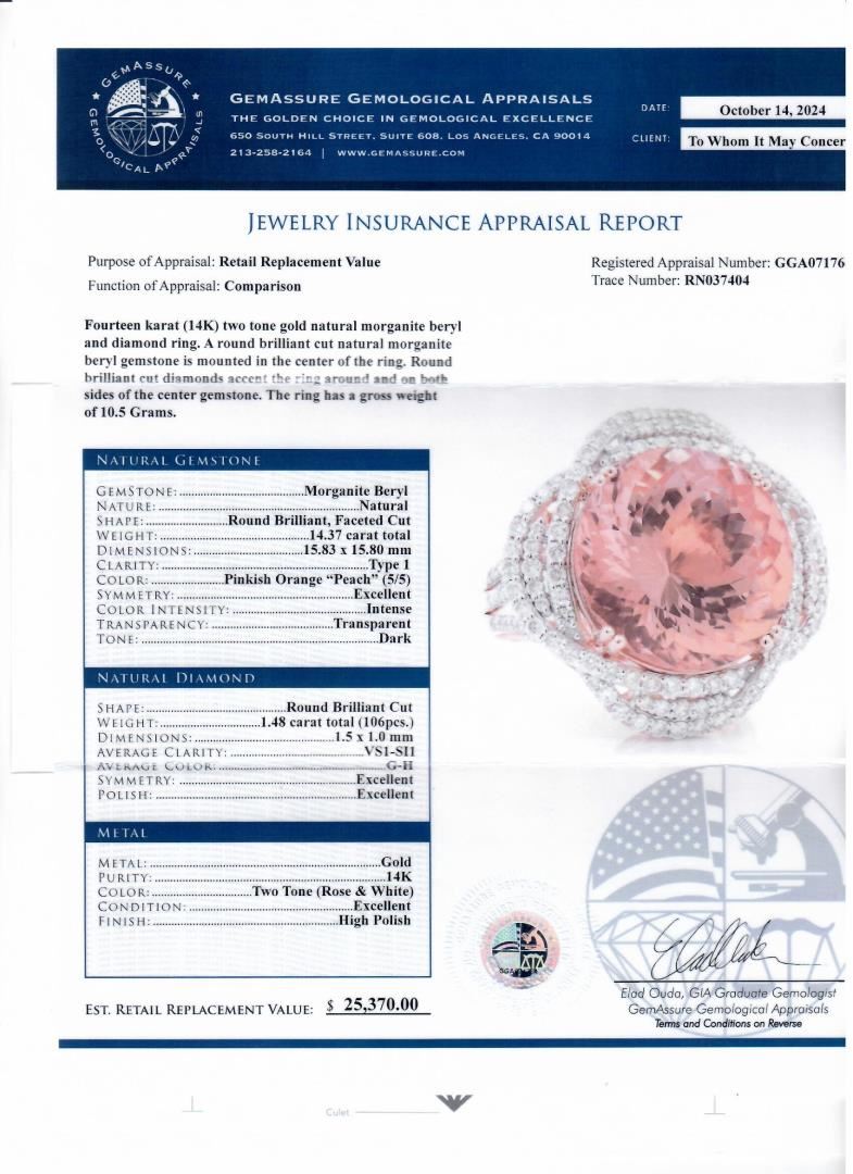 Fourteen karat (14K) two tone gold natural morganite beryl and diamond ring. A round brilliant cut natural morganite beryl gemstone is mounted in the center of the ring. Round brilliant cut diamonds accent the ring around and on both sides of the center gemstone. The ring has a gross weight of 10.5 Grams. #NATURAL GEMSTONE# GEMSTONE: Morganite Beryl; NATURE: Natural; SHAPE: Round Brilliant, Faceted Cut; WEIGHT: 14.37 carat total; DIMENSIONS: 15.83 x 15.80mm; CLARITY: Type 1; COLOR: Pinkish Orange "Peach" (5/5); SYMMETRY: Excellent; COLOR INTENSITY: Intense; TRANSPARENCY: Transparent; TONE: Dark #NATURAL DIAMOND# SHAPE: Round Brilliant Cut; WEIGHT: 1.48 carat total (106pcs.); DIMENSIONS: 1.5 x 1.0mm; AVERAGE CLARITY: VS1-SI1; AVERAGE COLOR: G-H; SYMMETRY: Excellent; POLISH: Excellent #METAL# METAL: Gold; PURITY: 14K; COLOR: Two Tone (Rose & White); CONDITION: Excellent; FINISH: High Polish #Size: 7 1/4