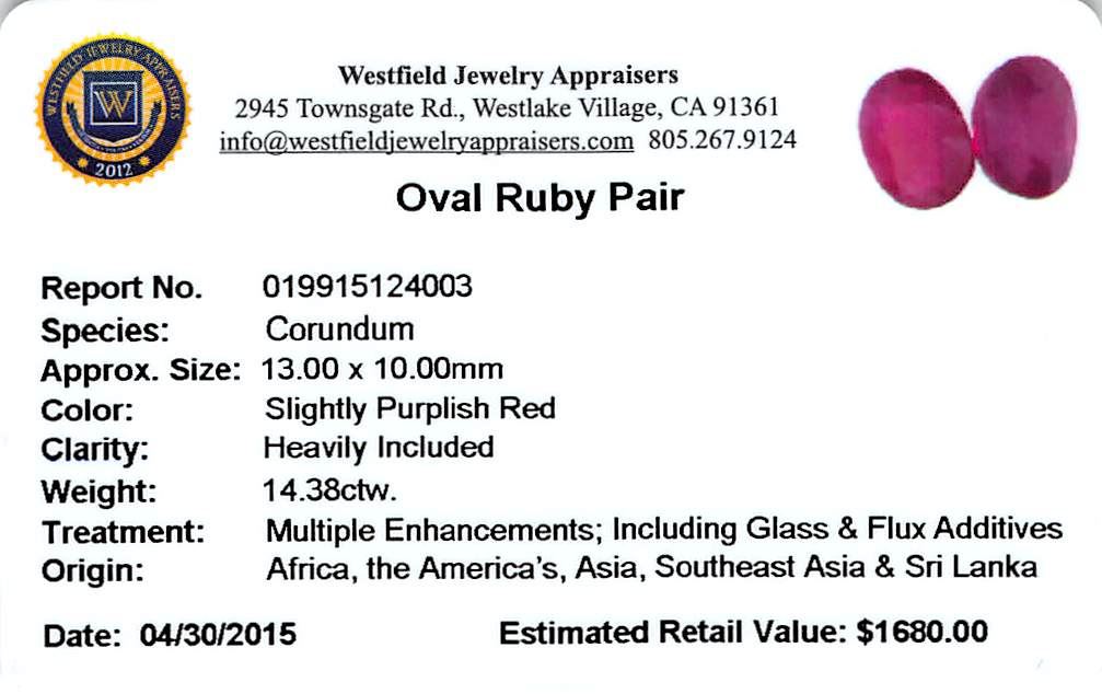 Two oval mixed cut natural rubies, measuring 13.00 x 10.00 x 6.00mm, exact total weight 14.38ct., clarity is heavily included, type II, medium dark, slightly brownish, slightly purplish red color, (GIA slpR 6/2), cut is good. Transmitting light somewhat diffusely, translucent. Naturally occurring internal & external characteristics are present. Indications of laboratory high temperature heat treatment, with glass & flux additives. Ruby has a low tolerance to rhodium plating, repolishing the surface, & ultrasonic cleaning. Westfield Appraised at $1,680.00.