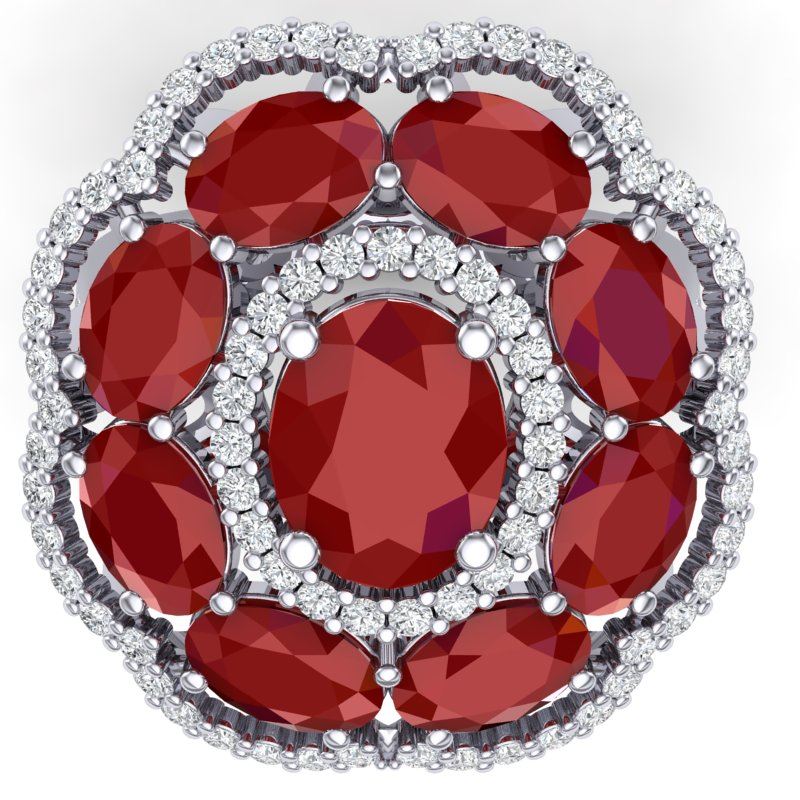 14.4 CTW Royalty Designer Ruby & VS Diamond Ring 18K White Gold ---- Luxury Designer Brand RIng Appraised Retail Price at $21,750 ---- SKU Number US39186 18K White gold RIng Size is 7, RIng measuring approx. 1 1/4 x 1 1/4 Inches, weighing in total approx. 15 grams. Made in the USA and is stamped 18K, Main stone 3.35 carat total weight containing 1 pieces of Intense Mid-Opaque Red color with AAA quality Oval shape cut Ruby , Stone #2 9.55 carat total weight containing 8 pieces of Intense Mid-Opaque Red color with AAA quality Oval shape cut