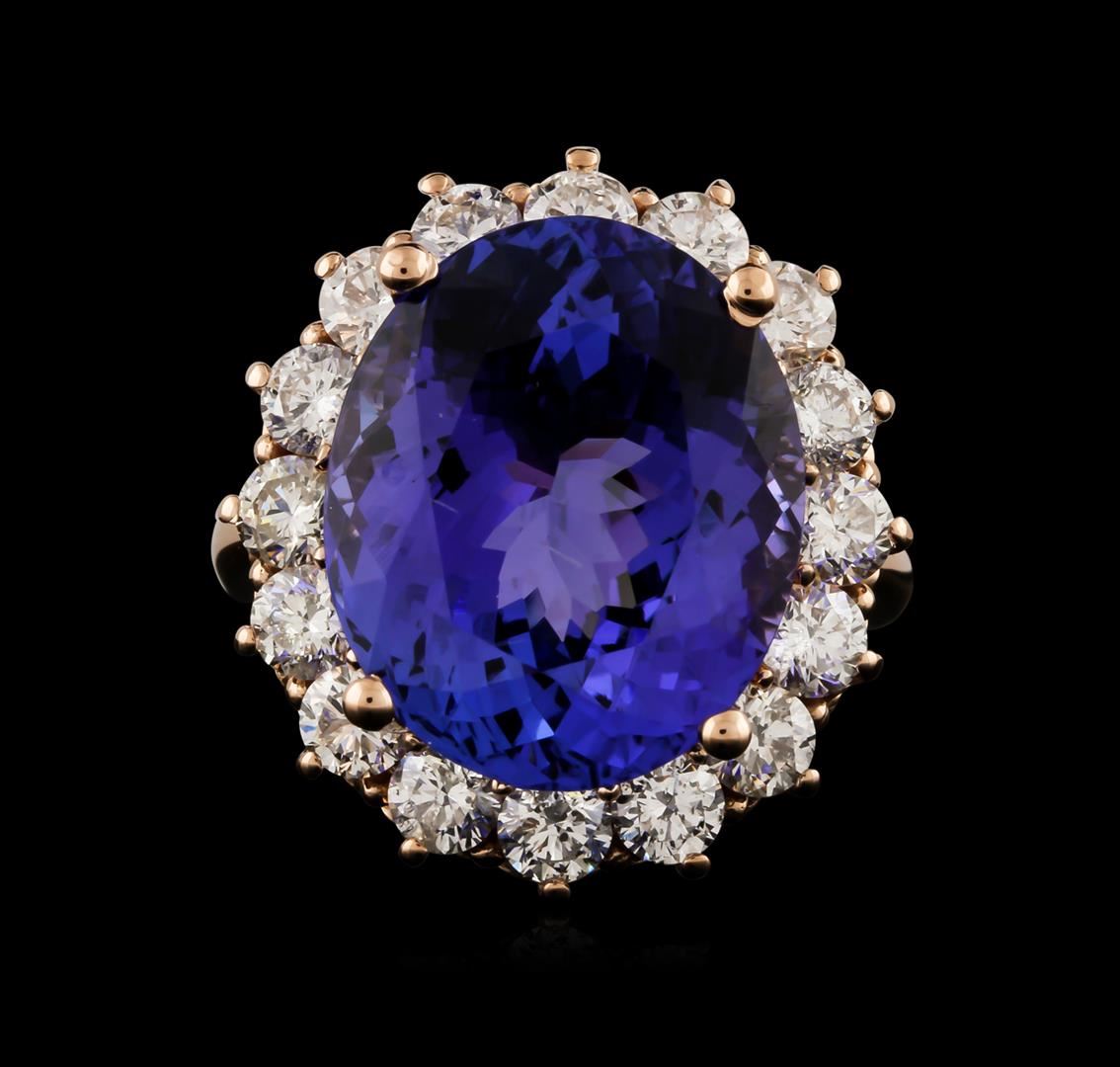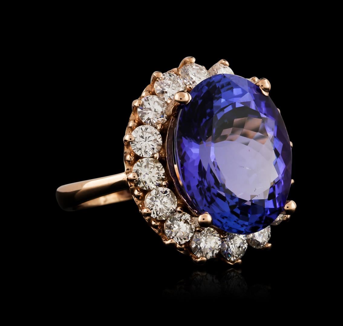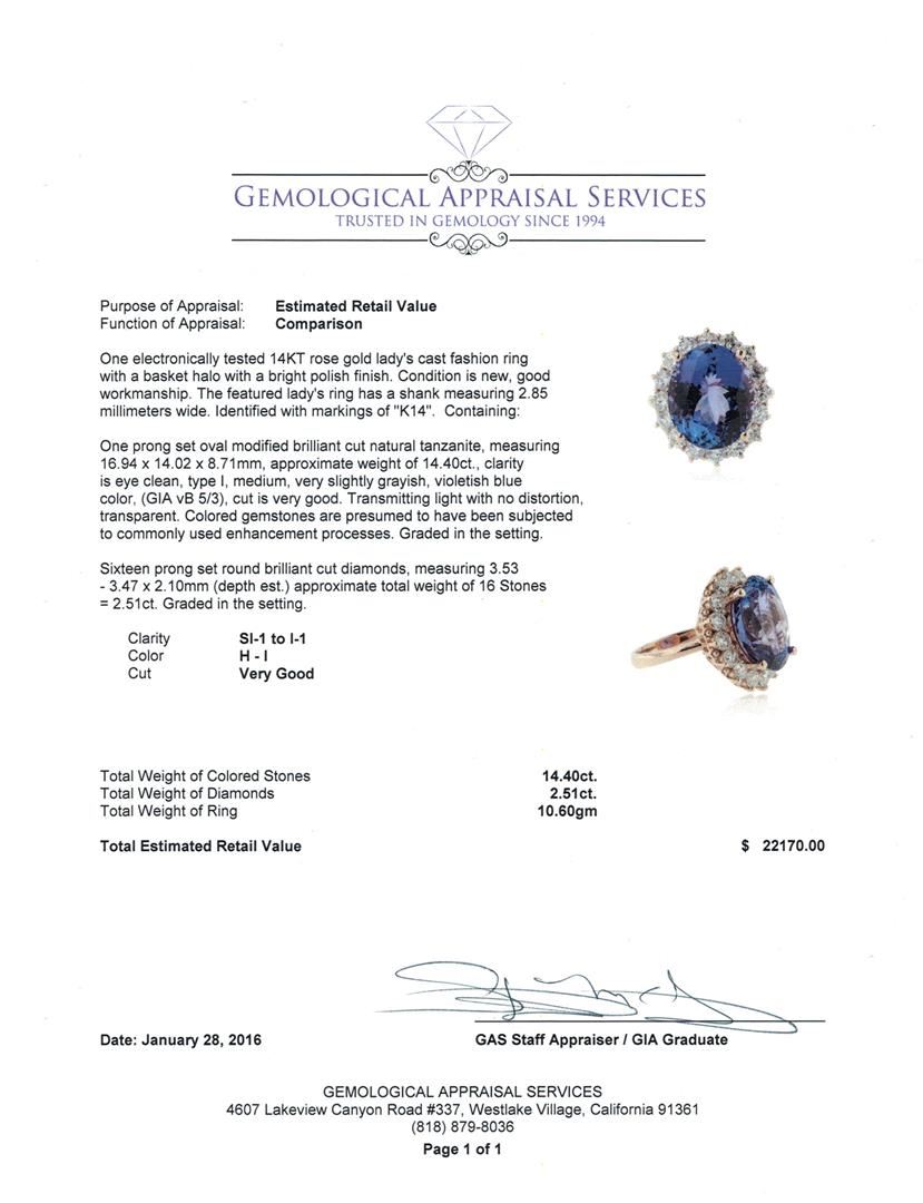 One electronically tested 14KT rose gold lady's cast fashion ring with a basket halo with a bright polish finish. The featured lady's ring has a shank measuring 2.85 millimeters wide. Identified with markings of "K14". Condition is new, good workmanship. Containing: One prong set oval modified brilliant cut natural tanzanite, measuring 16.94 x 14.02 x 8.71mm, approximate weight of 14.40ct., clarity is eye clean, type I, medium, very slightly grayish, violetish blue color, (GIA vB 5/3), cut is very good. Transmitting light with no distortion, transparent. Colored gemstones are presumed to have been subjected to commonly used enhancement processes. Graded in the setting.Sixteen prong set round brilliant cut diamonds, measuring 3.53 - 3.47 x 2.10mm (depth est.) approximate. Total Weight of 16 Stones = 2.51ct. Graded in the setting. Clarity: SI-1 to I-1. Color: H - ICut Very Good. Total Weight of Colored Stones 14.40ct. Total Weight of Diamonds 2.51ct. Total Weight of Ring 10.60gm. GAS Appraised at $22,170.00.