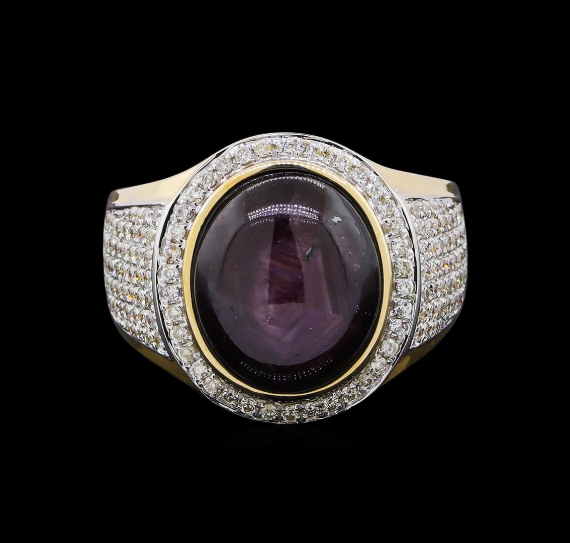One electronically tested 14KT yellow gold cast star ruby and diamond ring. The featured star ruby is set within a diamond bezel supported by tapering diamond set shoulders, completed by a four and one-half millimeter wide band. Bright polish finish with rhodium accents. Trademark is Orianne. Identified with markings of "14K". Condition is new, good workmanship. Containing: One bezel set oval cabochon cut natural star ruby approximate weight of 14.41ct., dark, very slightly brownish, strongly purplish red color, (GIA stpR 7/3), cut is good. This stone has a complete six ray star with strong intensity and good movement. Transmitting light very diffusely, opaque. Naturally occurring internal & external characteristics are present. No indications of heating. Graded in the setting. Ruby has a low tolerance to rhodium plating, repolishing the surface, & ultrasonic cleaning. One Hundred Thirty-Eight prong set round brilliant cut diamonds (depth est.) approximate total weight of 138 Stones = 0.81ct. Graded in the setting. Clarity: I-1 to I-3. Color: H - J. Total Weight of Colored Stones 14.41ct. Total Weight of Diamonds 0.81ct. Total Weight of Ring 14.02gm. AIG Appraised at $5,515.00.