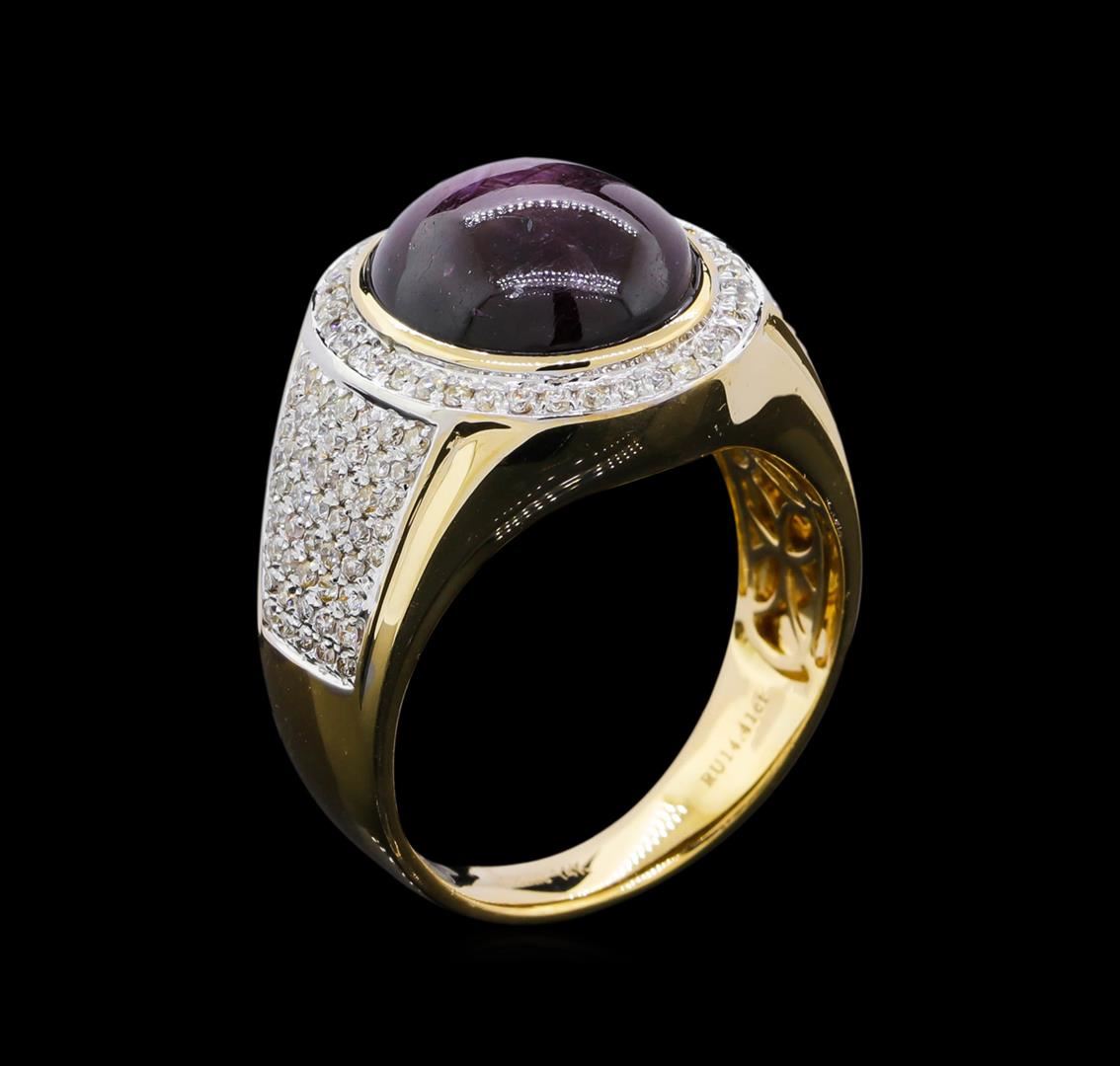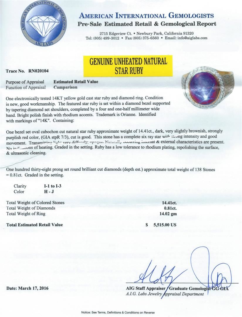 One electronically tested 14KT yellow gold cast star ruby and diamond ring. The featured star ruby is set within a diamond bezel supported by tapering diamond set shoulders, completed by a four and one-half millimeter wide band. Bright polish finish with rhodium accents. Trademark is Orianne. Identified with markings of "14K". Condition is new, good workmanship. Containing: One bezel set oval cabochon cut natural star ruby approximate weight of 14.41ct., dark, very slightly brownish, strongly purplish red color, (GIA stpR 7/3), cut is good. This stone has a complete six ray star with strong intensity and good movement. Transmitting light very diffusely, opaque. Naturally occurring internal & external characteristics are present. No indications of heating. Graded in the setting. Ruby has a low tolerance to rhodium plating, repolishing the surface, & ultrasonic cleaning. One Hundred Thirty-Eight prong set round brilliant cut diamonds (depth est.) approximate total weight of 138 Stones = 0.81ct. Graded in the setting. Clarity: I-1 to I-3. Color: H - J. Total Weight of Colored Stones 14.41ct. Total Weight of Diamonds 0.81ct. Total Weight of Ring 14.02gm. AIG Appraised at $5,515.00.