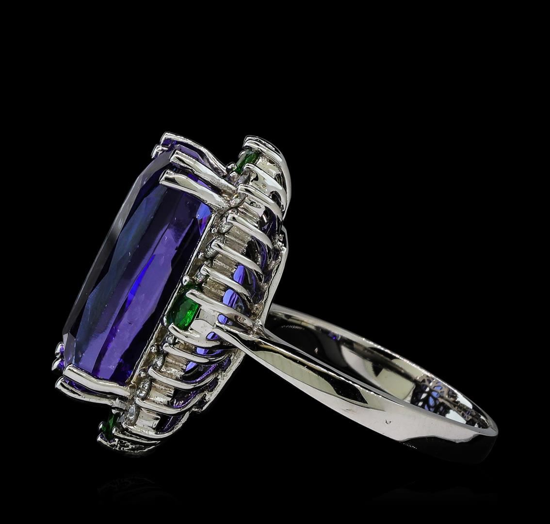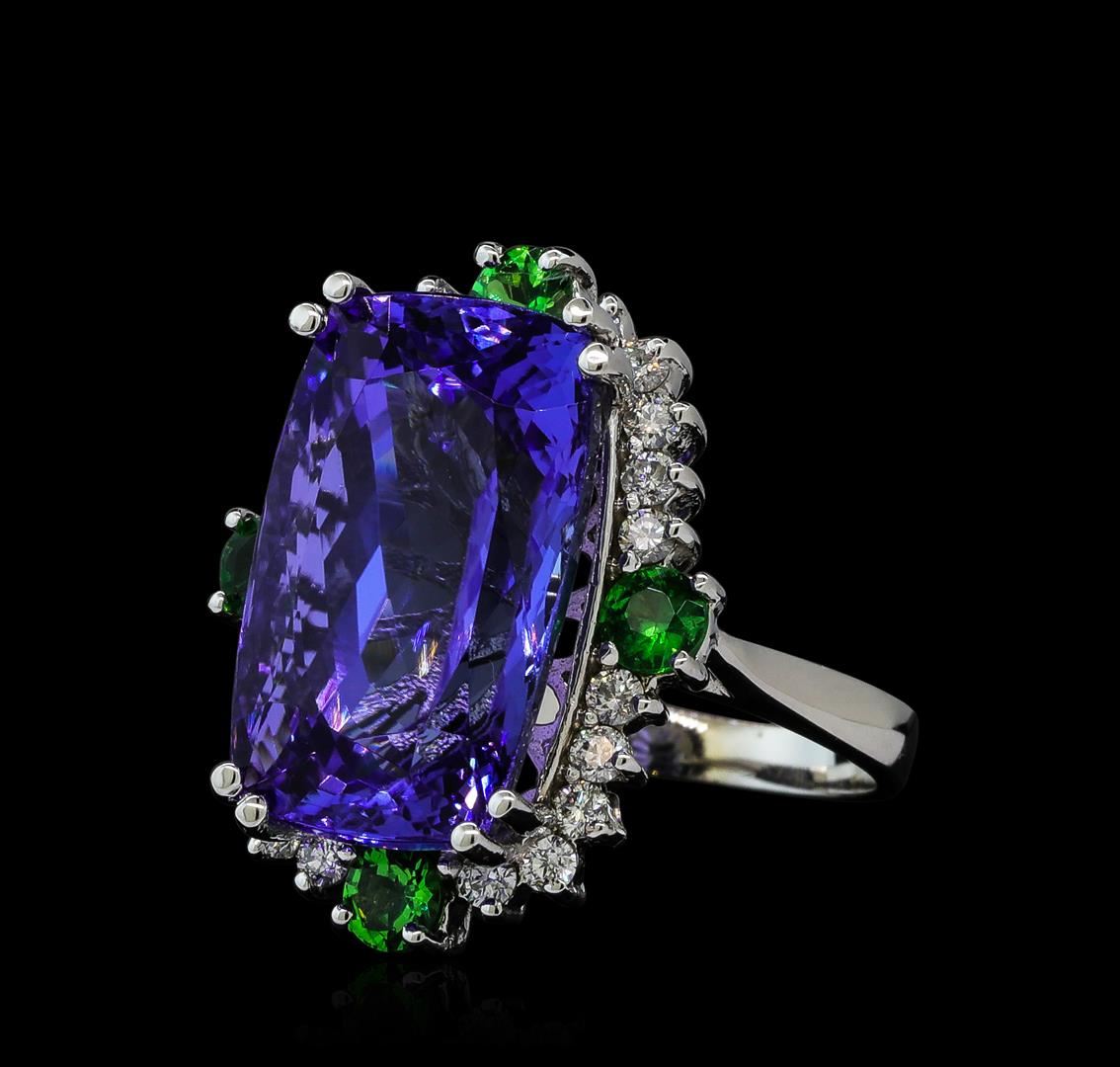 One electronically tested 14KT white gold ladies cast tanzanite, tsavorite and diamond ring with a bright polish finish. The featured tanzanite is set within a diamond floret with four tsavorite garnet accents supported by a ribbed under gallery, completed by a two millimeter wide band. Identified with markings of 'K14'. Condition is new, good workmanship. Containing: One prong set rectangular cushion mixed cut natural tanzanite, measuring 17.50 x 10.50 x 9.50mm, 5%. bulge factor, approximate weight of 14.43ct., clarity is eye clean, type I, medium, very slightly grayish, bluish violet color, (GIA bV 5/3), cut is good. Transmitting light with no distortion, transparent. Colored Stone Grading Report attached. Graded in the setting. Tanzanite is a very rare gemstone that is only found in the country of Tanzania. Originally discovered in 1967. Tiffany & Company, named the stone Tanzanite. It is found in the Usumburu Mountains that border the Umba Valley of northern Tanzania. Tanzanite occurs in gray, brown, violet, blue, reddish-purple, & green. The gem is interesting because of its exceptional pleochroism. Rotated in different directions a tanzanite will exhibit multiple changes of color. Tanzanite has a low tolerance to ultrasonic cleaning, and should not be cleaned using this method. Four prong set round mixed cut natural tsavorite garnets, measuring 3.50 - 3.50 x 2.28 mm, approximate total weight of 0.80ct., clarity is slightly included, type II, medium, moderately strong, slightly yellowish green color, (GIA slyG 5/4), cut is good. Transmitting light with a minimum of distortion, transparent. Naturally occurring internal & external characteristics are present. Measurements & the color grade are an average for the group. Graded in the setting. Twenty prong set round brilliant cut diamonds, measuring 1.80 - 1.80 x 1.08mm (depth est.) approximate total weight of 20 Stones = 0.47ct. The clarity grade reflects the entire range of clarity for this group. Graded in the setting. Clarity SI-1 to I-2. Color: F - H. Total Weight of Colored Stones 15.23ct.. Total Weight of Diamonds 0.47ct.. Total Weight of Ring 9.30gm. AIG Appraised at $32,725.00.