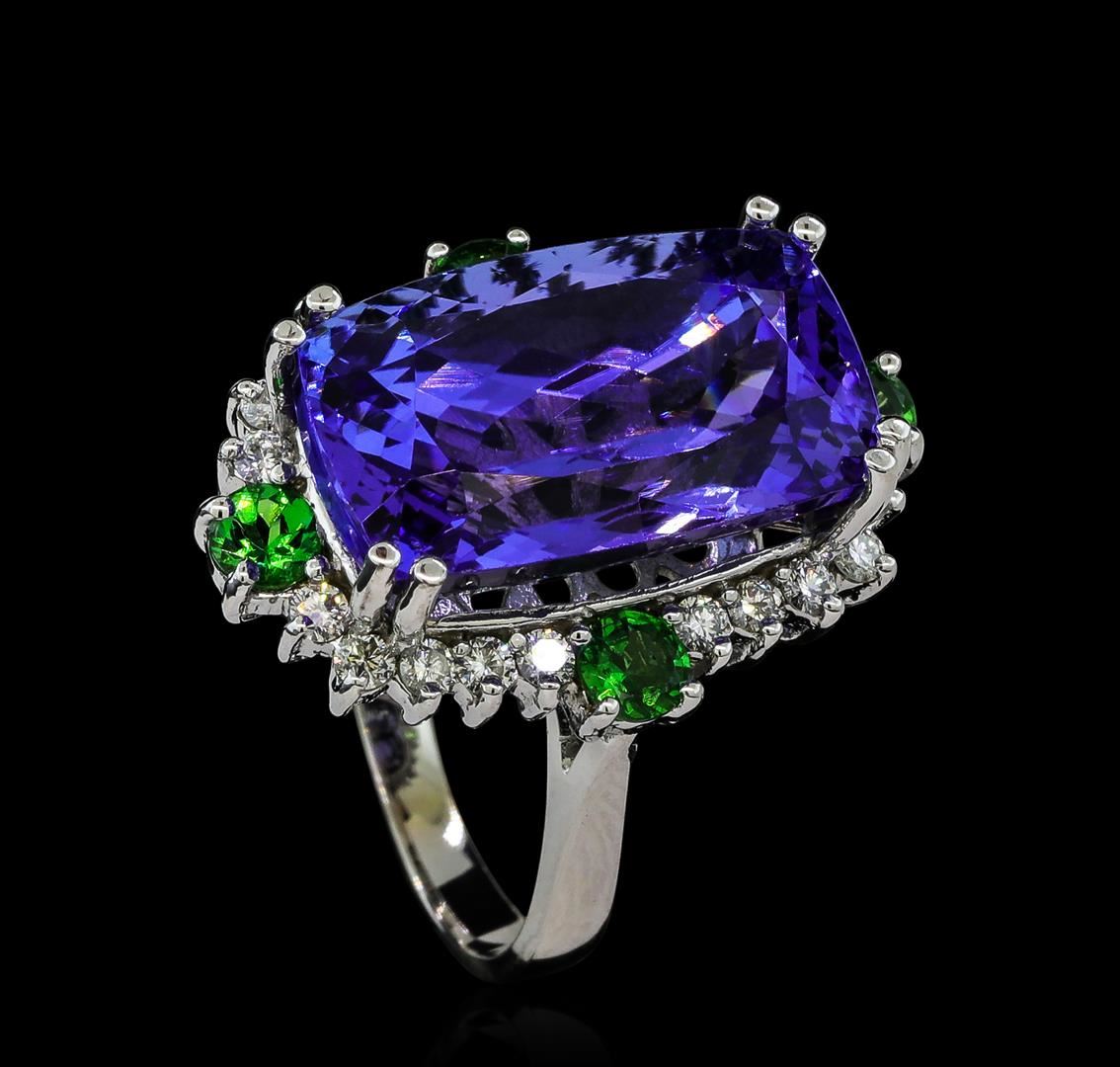 One electronically tested 14KT white gold ladies cast tanzanite, tsavorite and diamond ring with a bright polish finish. The featured tanzanite is set within a diamond floret with four tsavorite garnet accents supported by a ribbed under gallery, completed by a two millimeter wide band. Identified with markings of 'K14'. Condition is new, good workmanship. Containing: One prong set rectangular cushion mixed cut natural tanzanite, measuring 17.50 x 10.50 x 9.50mm, 5%. bulge factor, approximate weight of 14.43ct., clarity is eye clean, type I, medium, very slightly grayish, bluish violet color, (GIA bV 5/3), cut is good. Transmitting light with no distortion, transparent. Colored Stone Grading Report attached. Graded in the setting. Tanzanite is a very rare gemstone that is only found in the country of Tanzania. Originally discovered in 1967. Tiffany & Company, named the stone Tanzanite. It is found in the Usumburu Mountains that border the Umba Valley of northern Tanzania. Tanzanite occurs in gray, brown, violet, blue, reddish-purple, & green. The gem is interesting because of its exceptional pleochroism. Rotated in different directions a tanzanite will exhibit multiple changes of color. Tanzanite has a low tolerance to ultrasonic cleaning, and should not be cleaned using this method. Four prong set round mixed cut natural tsavorite garnets, measuring 3.50 - 3.50 x 2.28 mm, approximate total weight of 0.80ct., clarity is slightly included, type II, medium, moderately strong, slightly yellowish green color, (GIA slyG 5/4), cut is good. Transmitting light with a minimum of distortion, transparent. Naturally occurring internal & external characteristics are present. Measurements & the color grade are an average for the group. Graded in the setting. Twenty prong set round brilliant cut diamonds, measuring 1.80 - 1.80 x 1.08mm (depth est.) approximate total weight of 20 Stones = 0.47ct. The clarity grade reflects the entire range of clarity for this group. Graded in the setting. Clarity SI-1 to I-2. Color: F - H. Total Weight of Colored Stones 15.23ct.. Total Weight of Diamonds 0.47ct.. Total Weight of Ring 9.30gm. AIG Appraised at $32,725.00.
