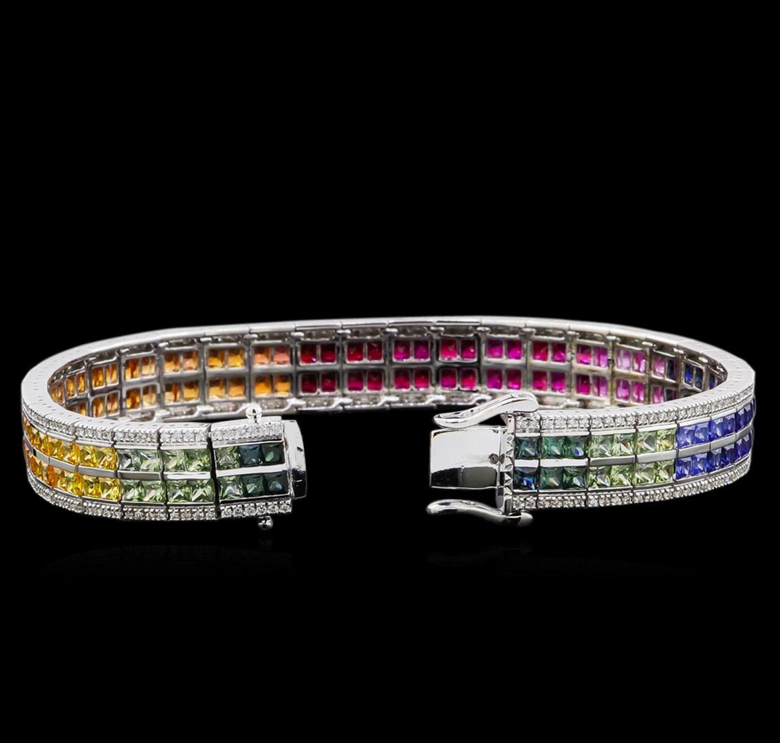 One electronically tested 14KT white gold lady's cast fashion straight line tennis bracelet with a tongue clasp with foldover safety with a bright polish finish. The featured lady's bracelet has a double row of multi color sapphires measuring 7.0 inches in length. Identified with markings of "14K". Condition is new, good workmanship. Containing: One hundred forty-four channel set princess modified brilliant cut natural multi-color sapphires, measuring 2.50 x 2.45 x 0.00mm, (depth est.) approximate total weight of 14.45ct., clarity is eye clean, cut is very good. The featured sapphires range in color from green to blue to pink to red to orange to orange-yellow to yellow. Colored gemstones are presumed to have been subjected to commonly used enhancement processes. Graded in the setting. Two Hundred Eighty-Eight prong set round brilliant cut diamonds, measuring 1.00 - 0.95 x 0.61mm (depth est.) approximate total weight of 288 Stones = 1.09ct. Graded in the setting. Clarity: VS-2 to SI-1. Color: G - Good. Total Weight of Colored Stones 14.45ct. Total Weight of Diamonds 1.09ct. Total Weight of Straight Line Tennis Bracelet 32.00gm. GAS Appraised at $16,800.00.