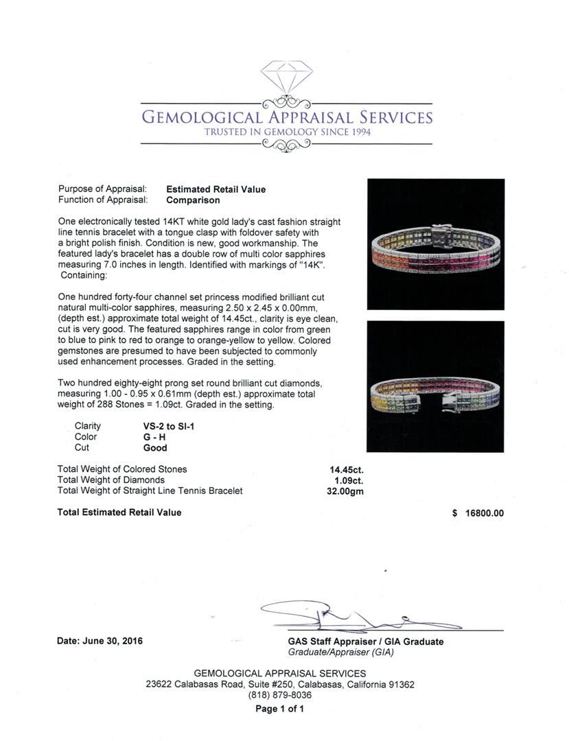 One electronically tested 14KT white gold lady's cast fashion straight line tennis bracelet with a tongue clasp with foldover safety with a bright polish finish. The featured lady's bracelet has a double row of multi color sapphires measuring 7.0 inches in length. Identified with markings of "14K". Condition is new, good workmanship. Containing: One hundred forty-four channel set princess modified brilliant cut natural multi-color sapphires, measuring 2.50 x 2.45 x 0.00mm, (depth est.) approximate total weight of 14.45ct., clarity is eye clean, cut is very good. The featured sapphires range in color from green to blue to pink to red to orange to orange-yellow to yellow. Colored gemstones are presumed to have been subjected to commonly used enhancement processes. Graded in the setting. Two Hundred Eighty-Eight prong set round brilliant cut diamonds, measuring 1.00 - 0.95 x 0.61mm (depth est.) approximate total weight of 288 Stones = 1.09ct. Graded in the setting. Clarity: VS-2 to SI-1. Color: G -  Good. Total Weight of Colored Stones 14.45ct. Total Weight of Diamonds 1.09ct. Total Weight of Straight Line Tennis Bracelet 32.00gm. GAS Appraised at $16,800.00.