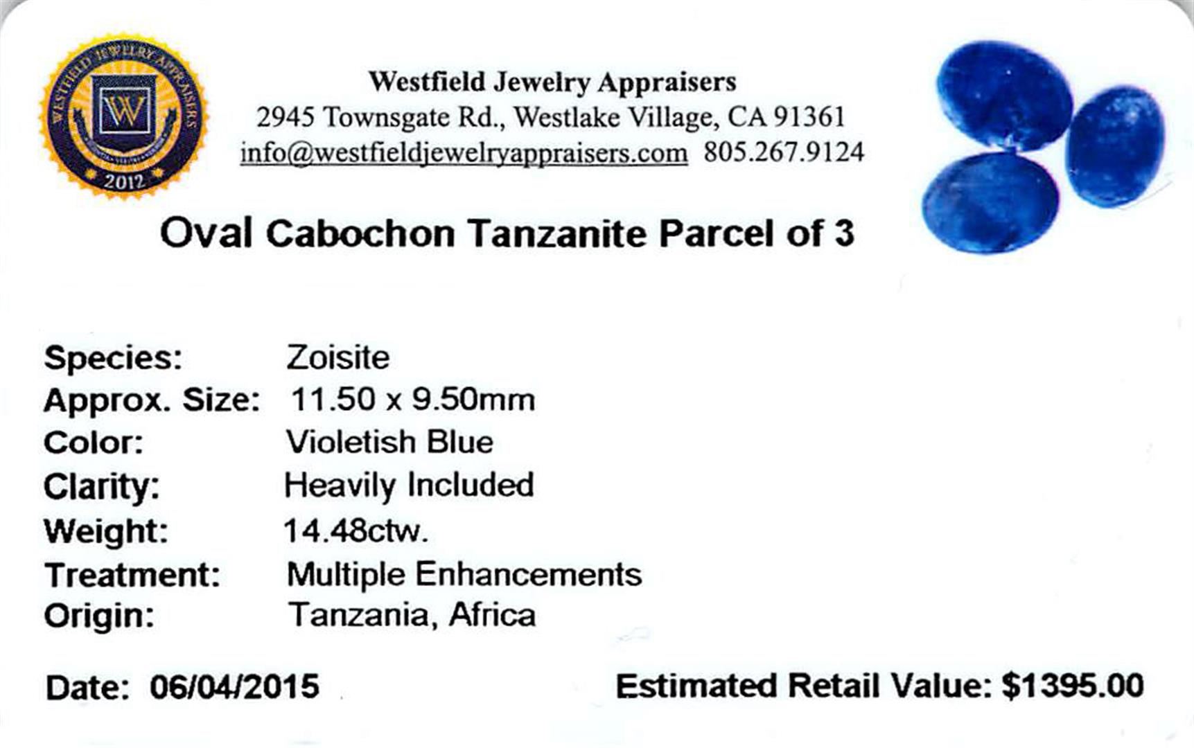 Three oval cabochon cut natural tanzanites, measuring 11.50 x 9.50 x 6.18mm, exact total weight 14.48ct., clarity is heavily included, type I, dark, moderately strong, violetish blue color, (GIA vB 7/4), cut is good. Transmitting light somewhat diffusely, transparent to translucent. Naturally occurring internal & external characteristics are present. Measurements & the color grade are an average for the group. Tanzanite is a very rare gemstone that is only found in the country of Tanzania. Originally discovered in 1967. Tiffany & Company, named the stone Tanzanite. It is found in the Usumburu Mountains that border the Umba Valley of northern Tanzania. Tanzanite occurs in gray, brown, violet, blue, reddish-purple, & green. The gem is interesting because of its exceptional pleochroism. Rotated in different directions a tanzanite will exhibit multiple changes of color. Tanzanite has a low tolerance to ultrasonic cleaning, and should not be cleaned using this method. Westfield Appraised at $1,395.00.