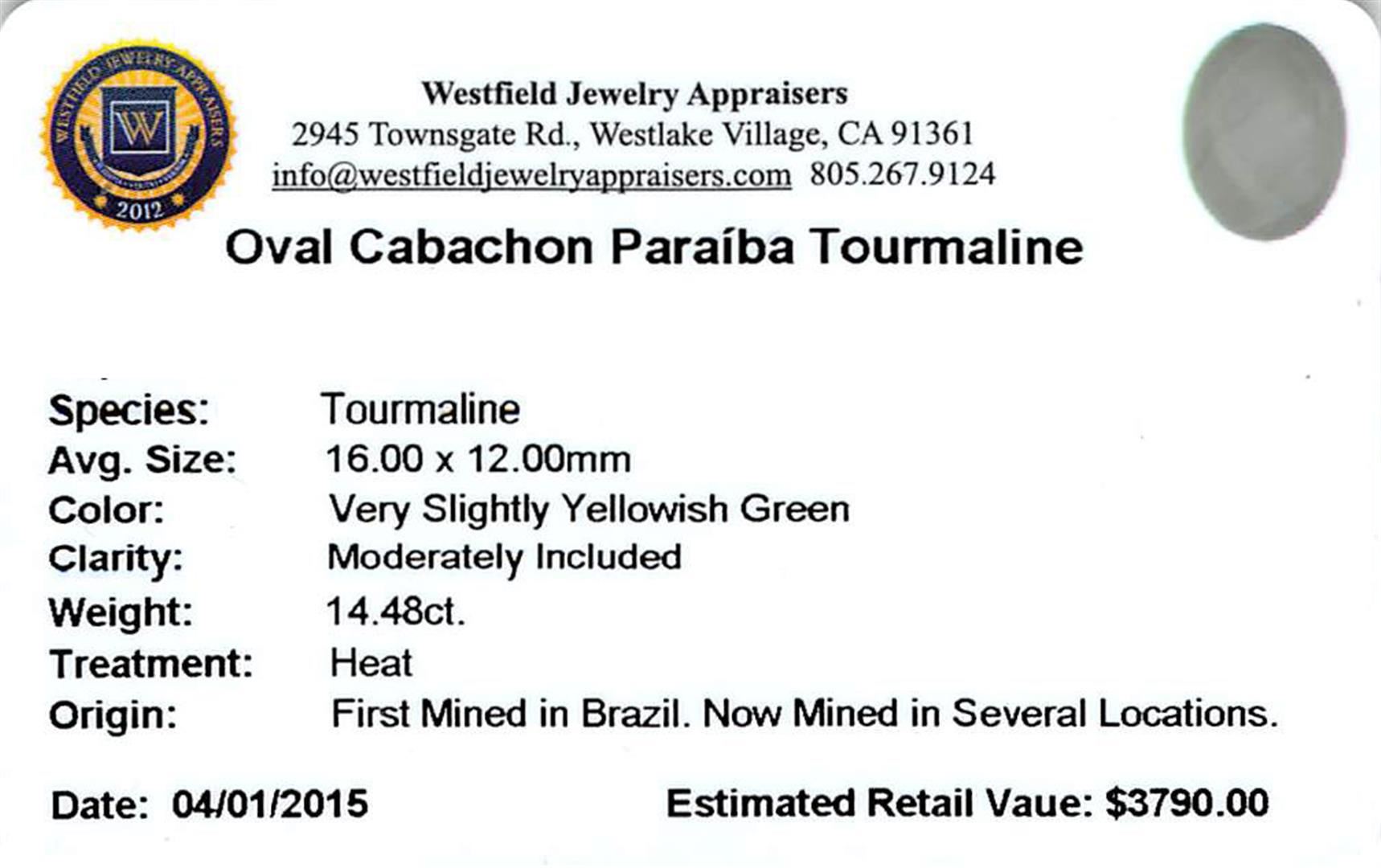 One oval cabochon cut natural Paraiba tourmaline exact weight 14.48ct., clarity is moderately included, cut is good. Westfield Appraised at $3,790.00.