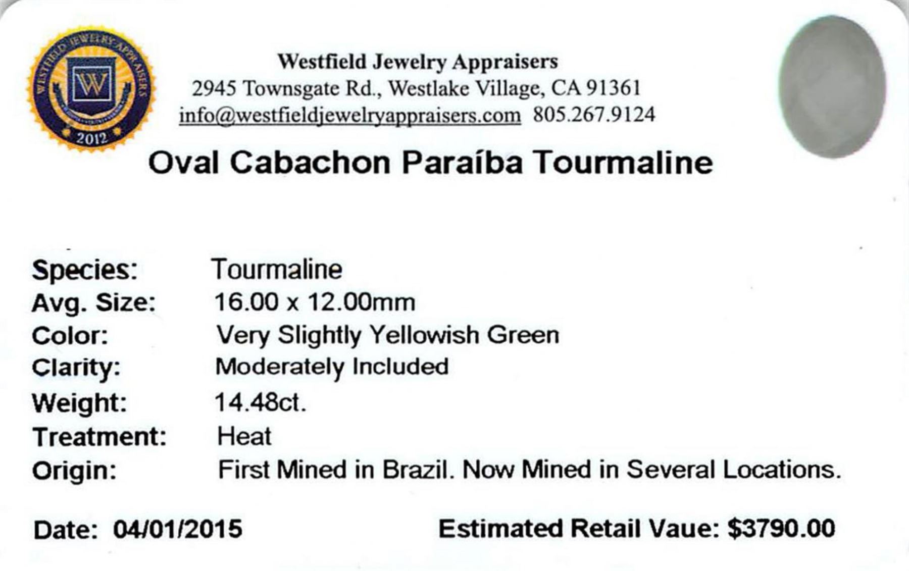 One oval cabochon cut natural Paraiba tourmaline exact weight 14.48ct., clarity is moderately included, cut is good. Westfield Appraised.