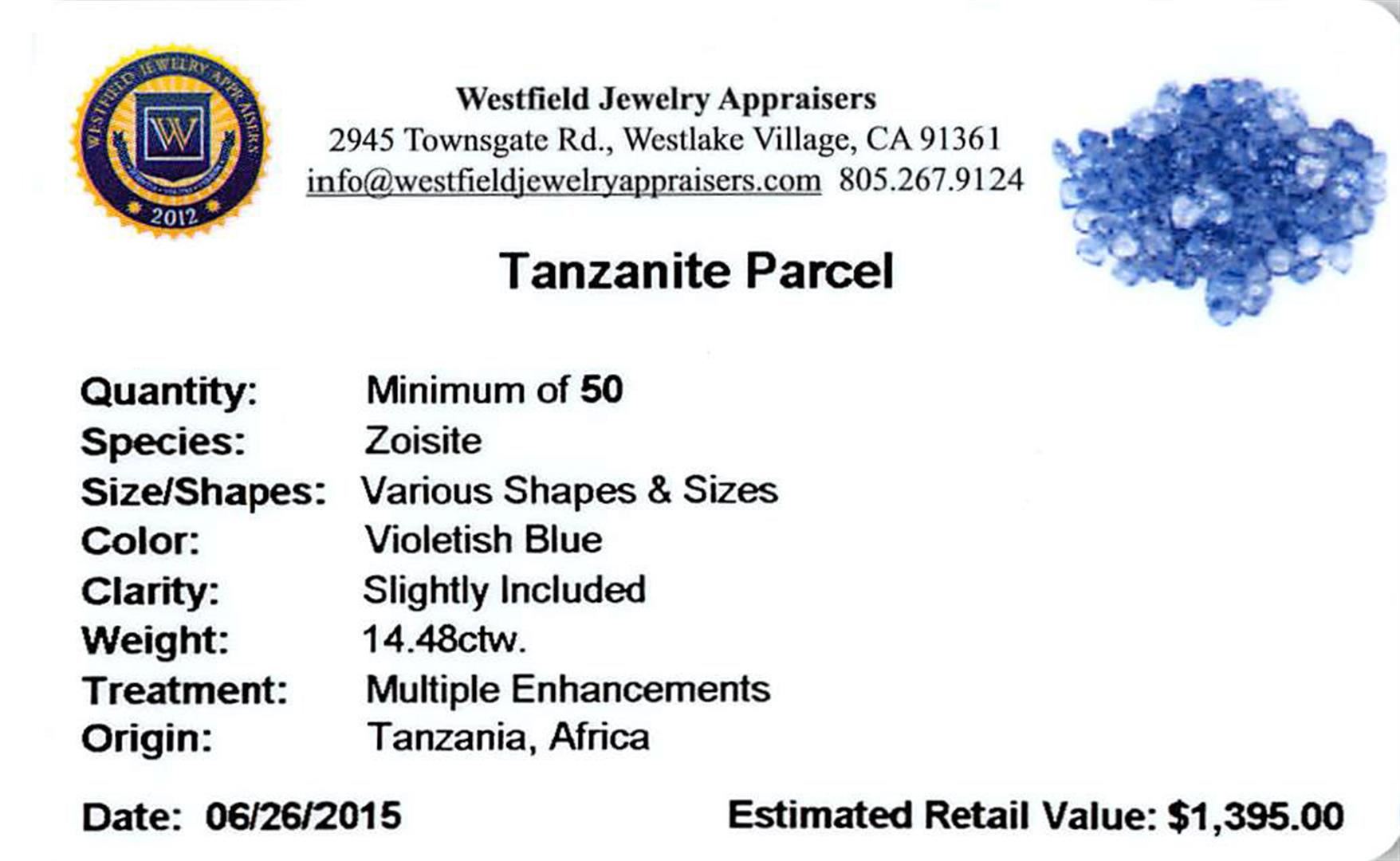 Fifty round mixed cut natural tanzanites, measuring 3.00 - 3.00 x 1.95 mm, exact total weight 14.48ct., clarity is slightly included, type I, medium, very slightly grayish, violetish blue color, (GIA vB 5/3), cut is good. Measurements & the color grade are an average for the group, Color grade is an average for the group, Transmitting light with no distortion, transparent, Naturally occurring internal & external characteristics are present, Indications of multiple laboratory enhancements, including high temperature heat treatment. Westfield Appraised at $1,395.00.